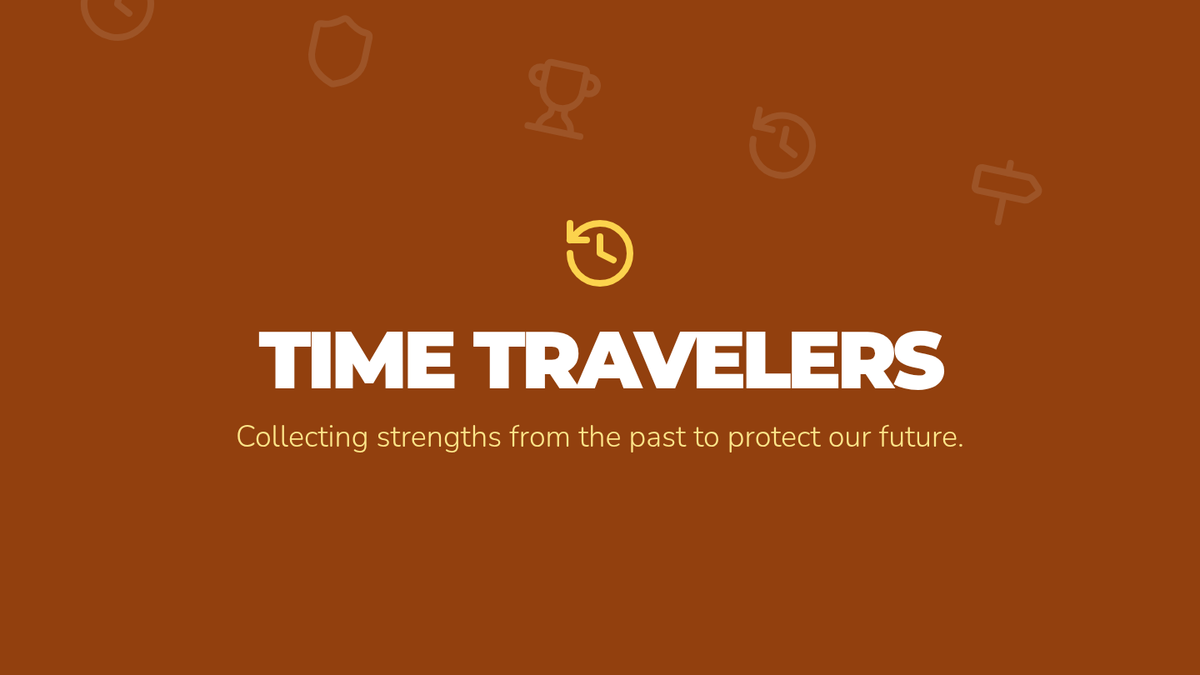 Visual presentation for the 'Time Travelers' mentoring session. It connects history with personal growth, encouraging students to identify their 'inner archive' of strengths and build a resilient mindset for the future.