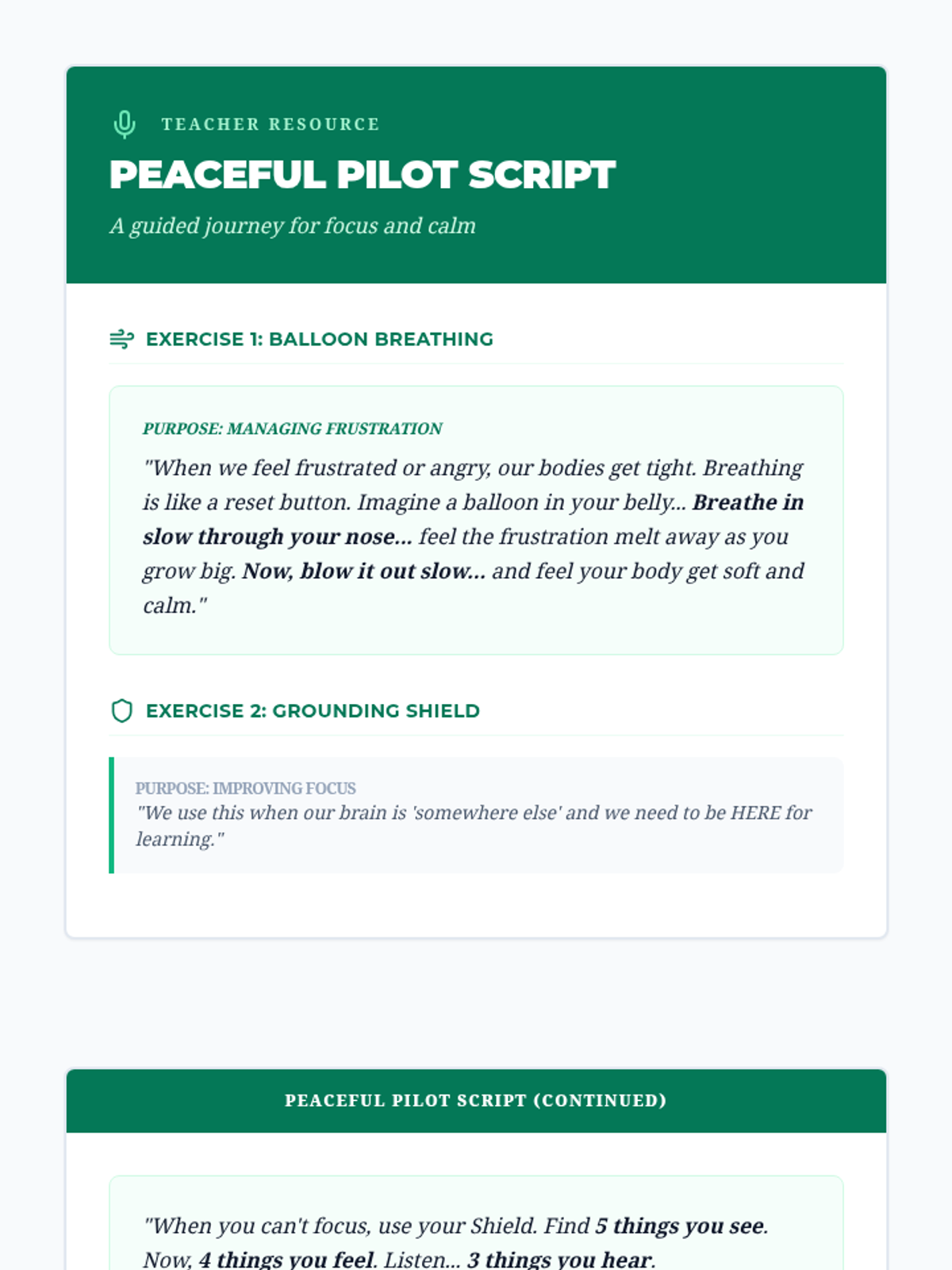 Step-by-step teacher script for leading deep breathing, 5-4-3-2-1 grounding, and positive self-talk exercises with K-2 students.