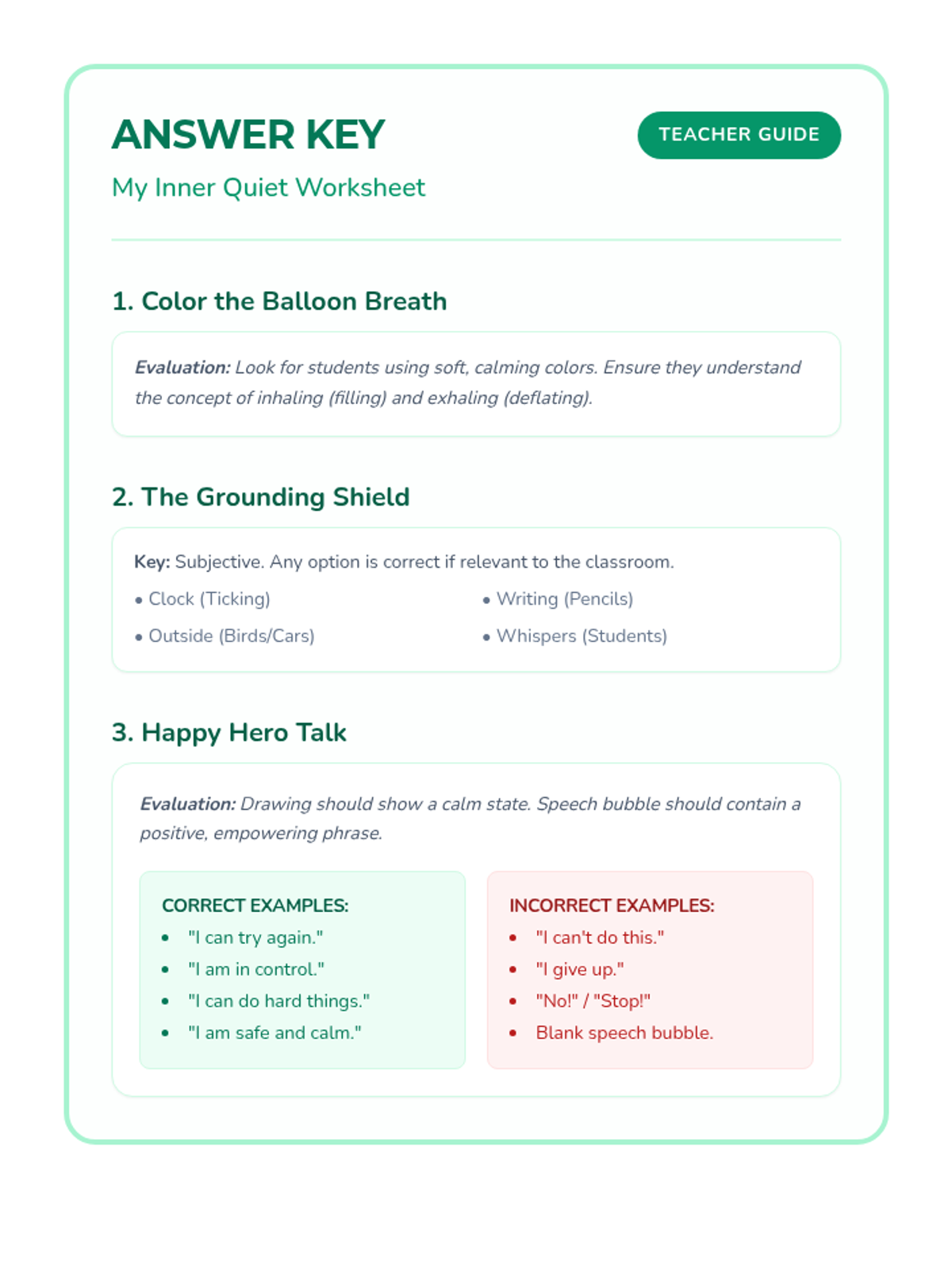 Teacher answer key and evaluation guide for the "My Inner Quiet" student worksheet.