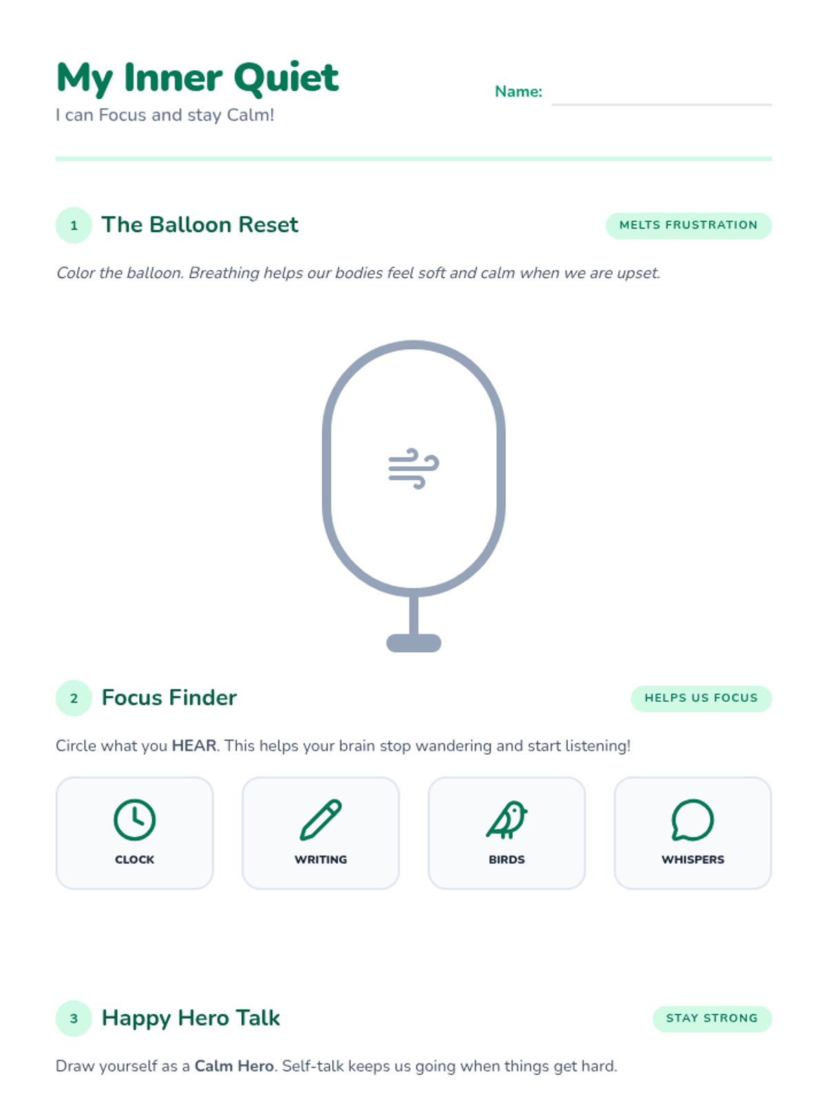 Student worksheet for K-2 to practice self-calming skills, including a balloon breathing activity, classroom grounding search, and self-talk drawing prompt.