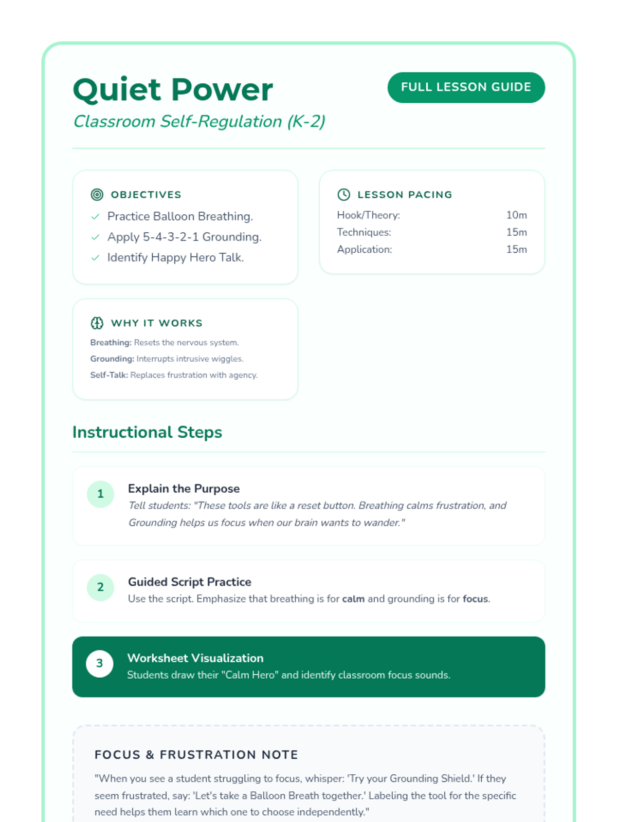 Comprehensive lesson plan for K-2 students on self-calming and focus, including objectives, materials, and a step-by-step procedure.