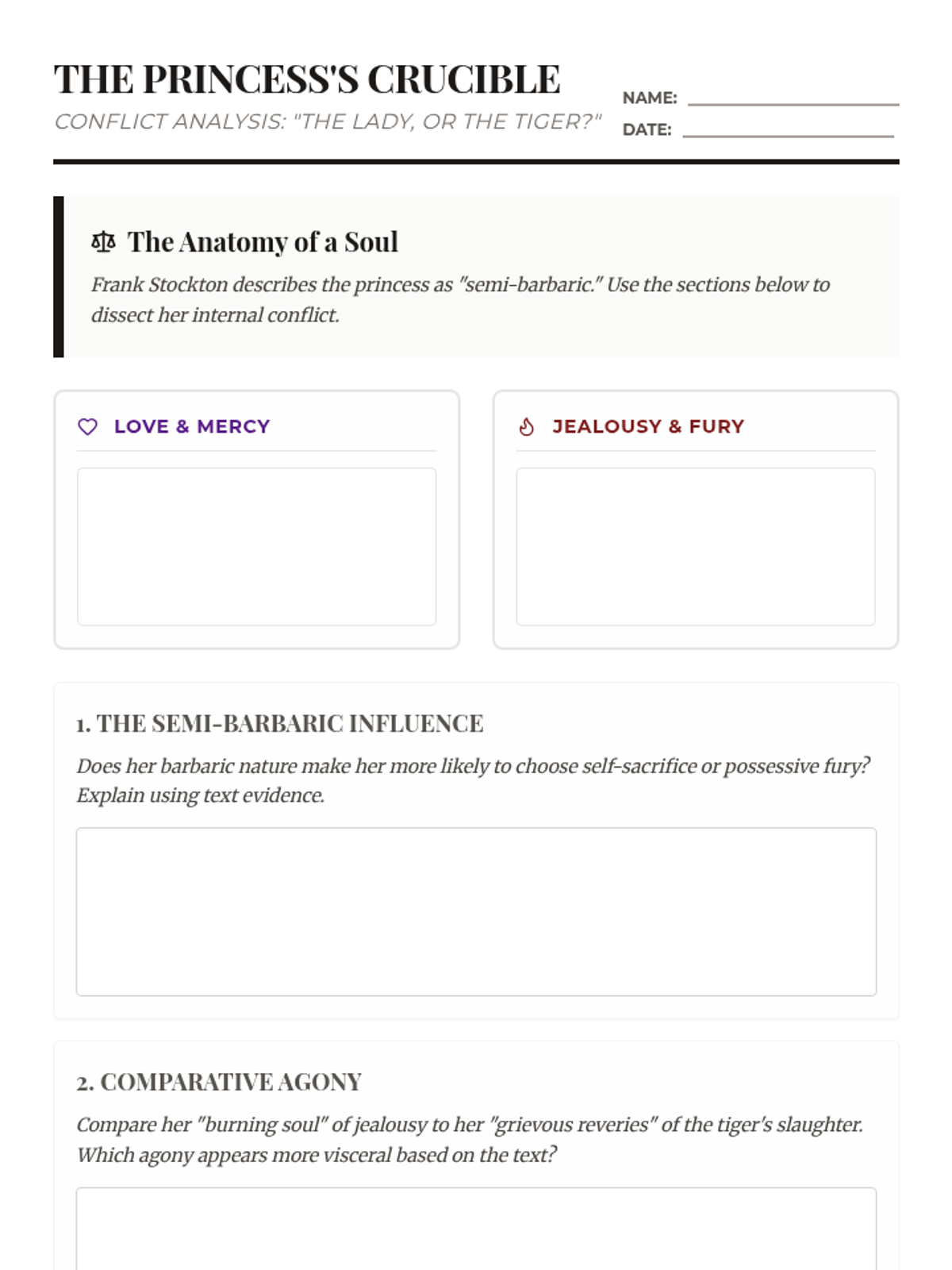 A structured worksheet for students to map out the princess's dual internal conflicts. It includes graphic organizers for Love vs. Hate and deep-dive analytical questions requiring textual evidence.