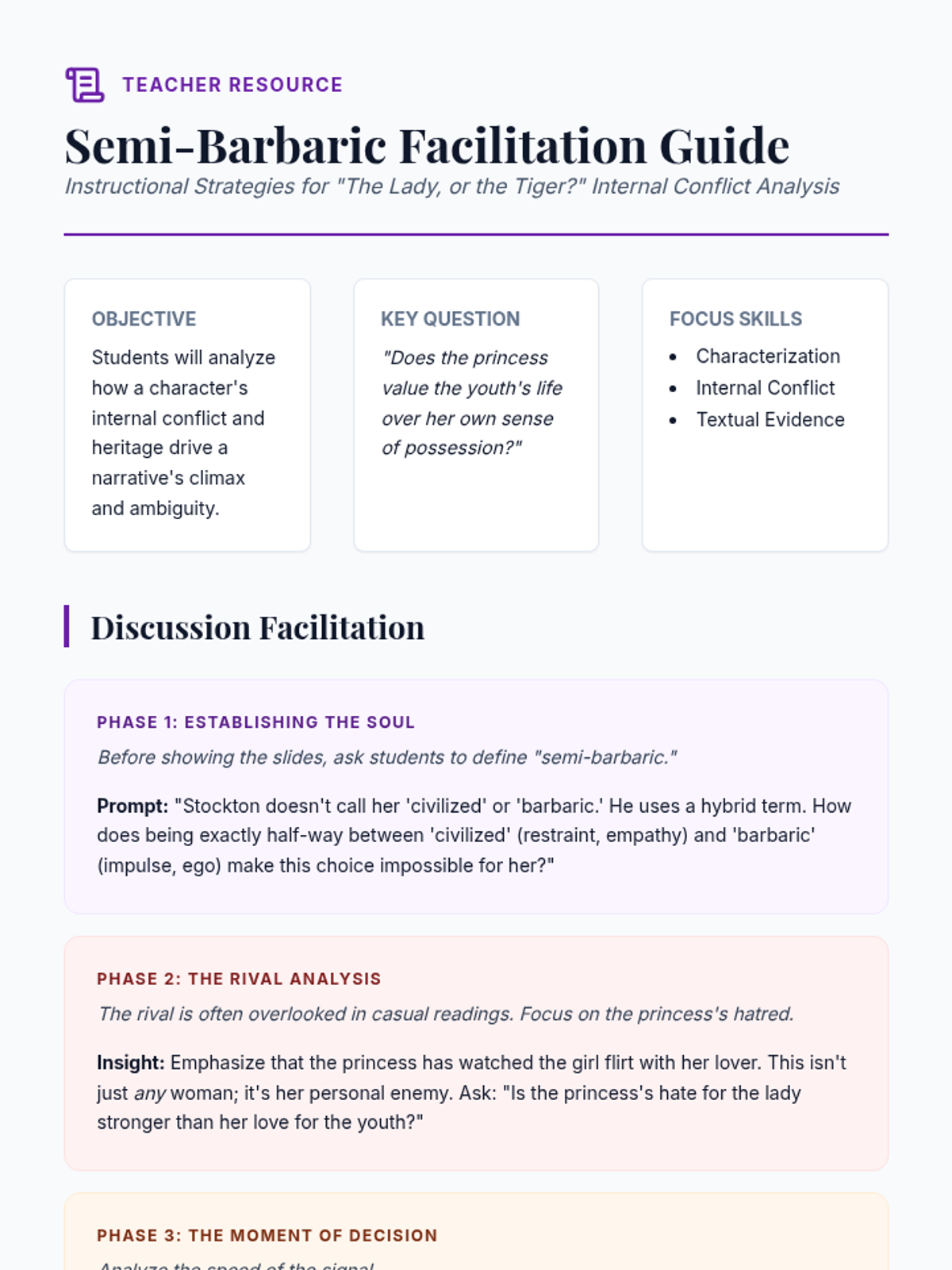 A comprehensive facilitation guide for teachers, providing structured discussion phases, differentiation strategies, and insights into common student misconceptions regarding the princess's motivations.
