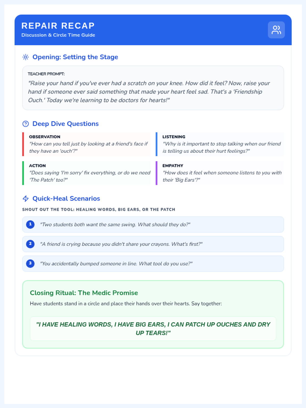 A teacher's discussion guide for circle time, featuring opening prompts, deep-dive questions, rapid-fire scenarios, and a classroom closing ritual to reinforce friendship repair skills.
