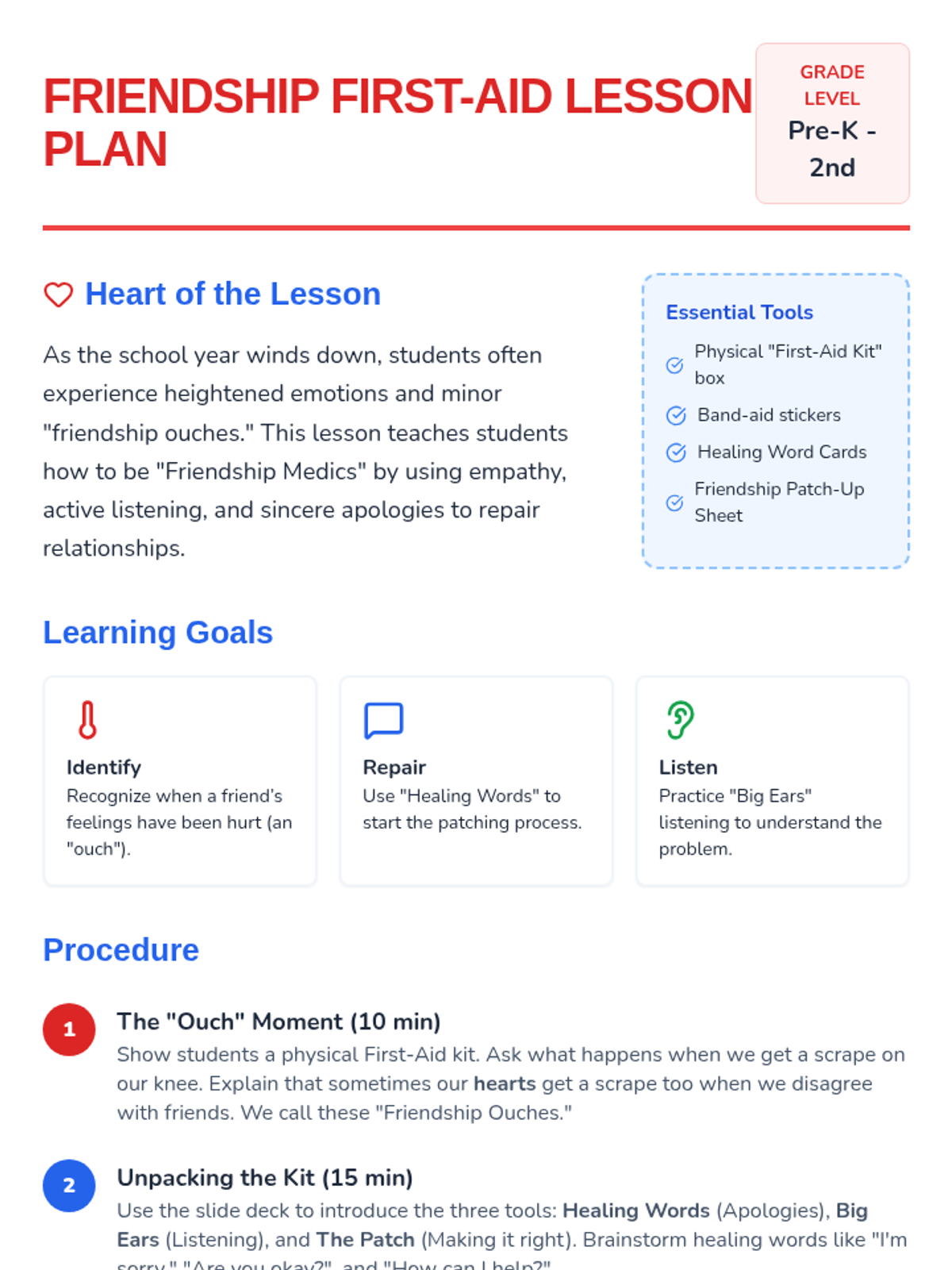 A comprehensive teacher's guide for the Friendship First-Aid Kit lesson, including learning objectives, a step-by-step procedure, materials list, and differentiation strategies for Pre-K through 2nd grade.