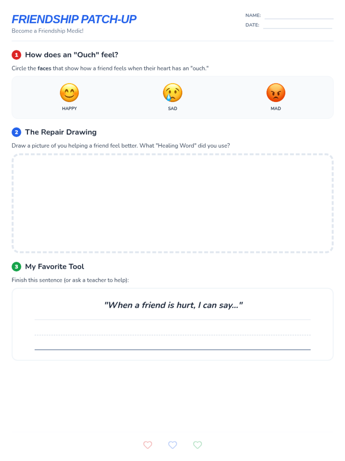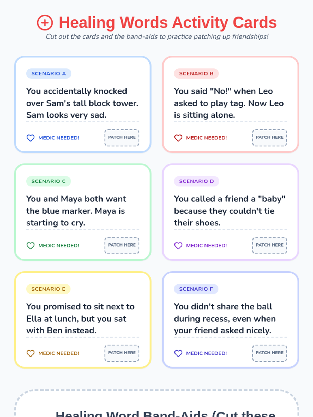 A set of printable scenario cards and "Healing Word Band-Aids" for hands-on practice in identifying social conflicts and applying appropriate restorative language.
