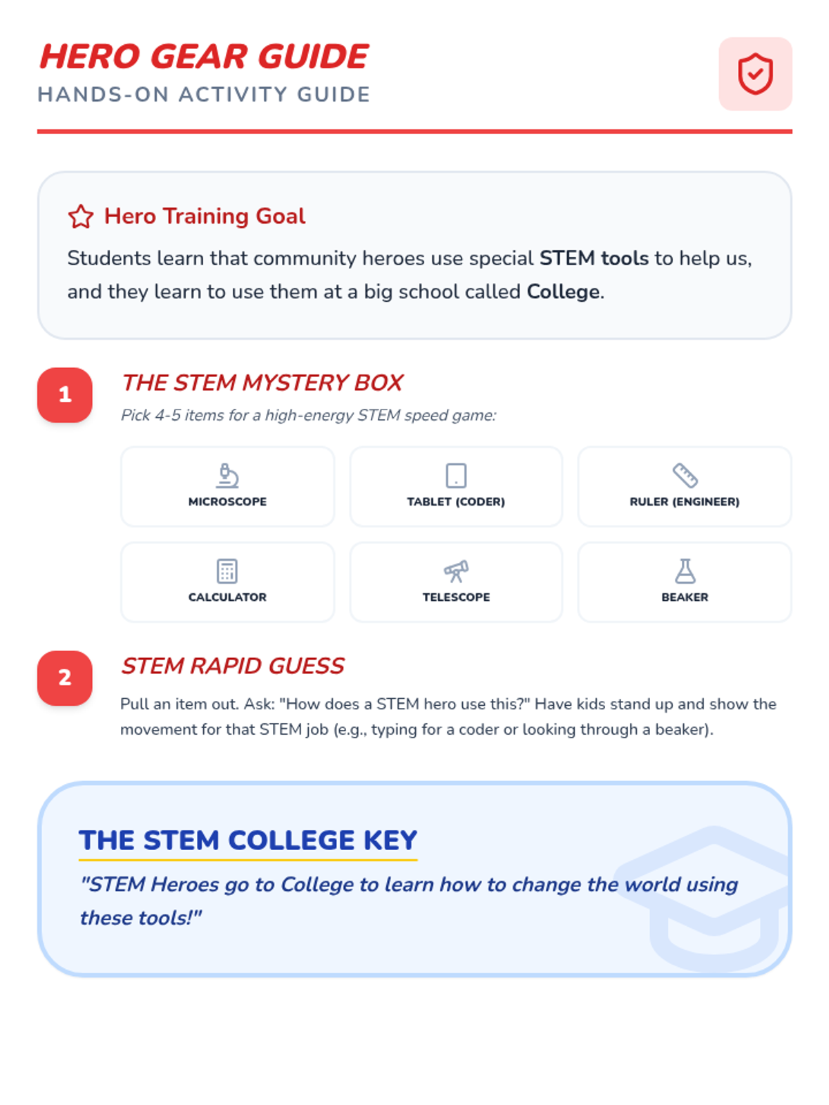 Updated hands-on activity guide for K-1 students with a specific STEM tool focus (Telescopes, Beakers, Tablets), integrating STEM roles into the "Hero Gear" mystery box game.