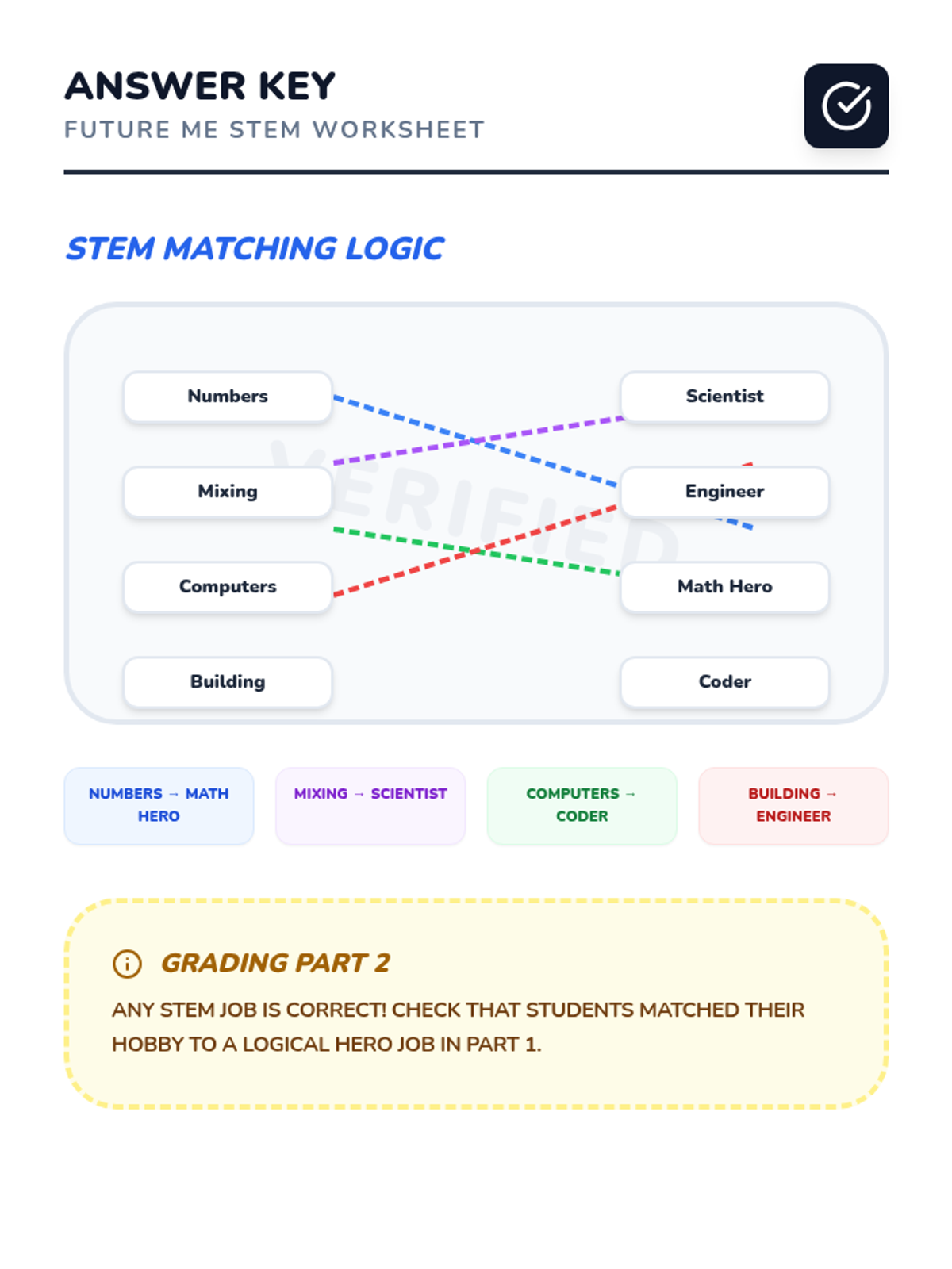 Teacher answer key for the STEM-focused "Future Me" worksheet, with logical matching for Science, Tech, Engineering, and Math pairs. Fixes line mapping and text consistency.