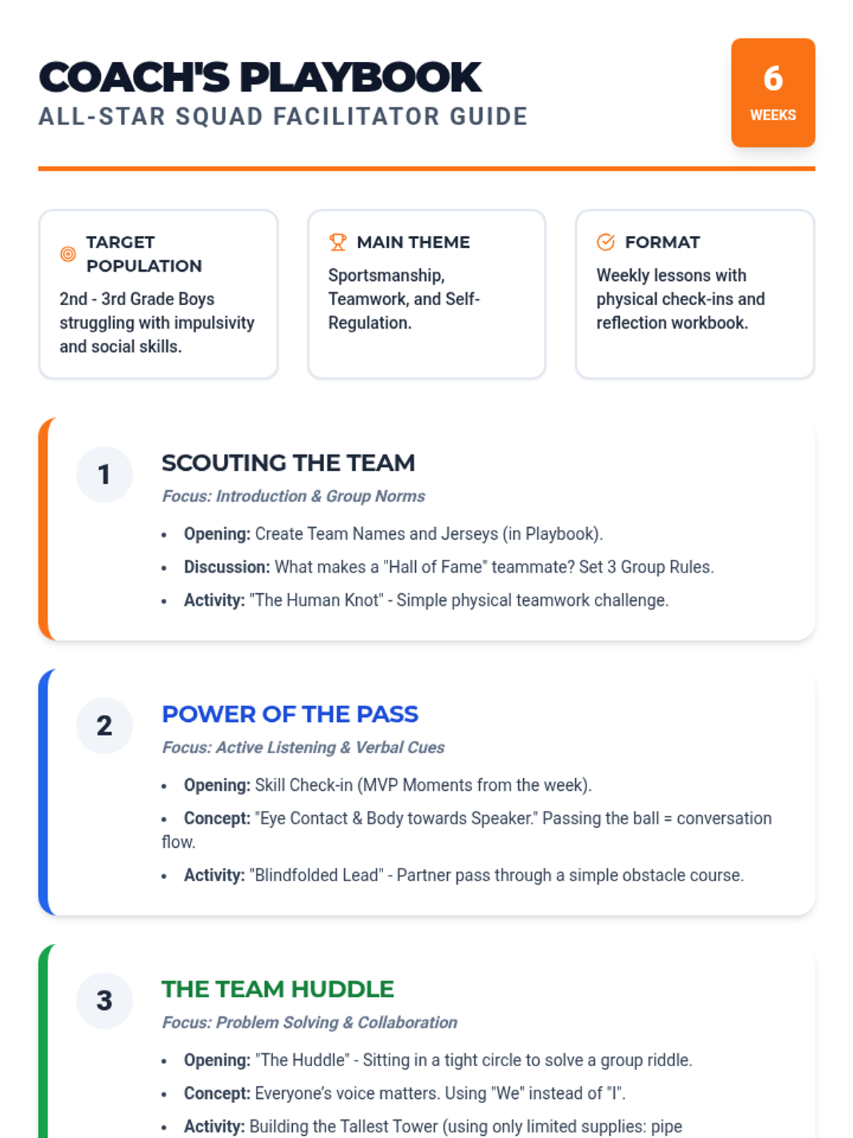 A comprehensive 6-week facilitator guide for a boys' social skills group, featuring weekly lesson themes, activities, and coaching tips.