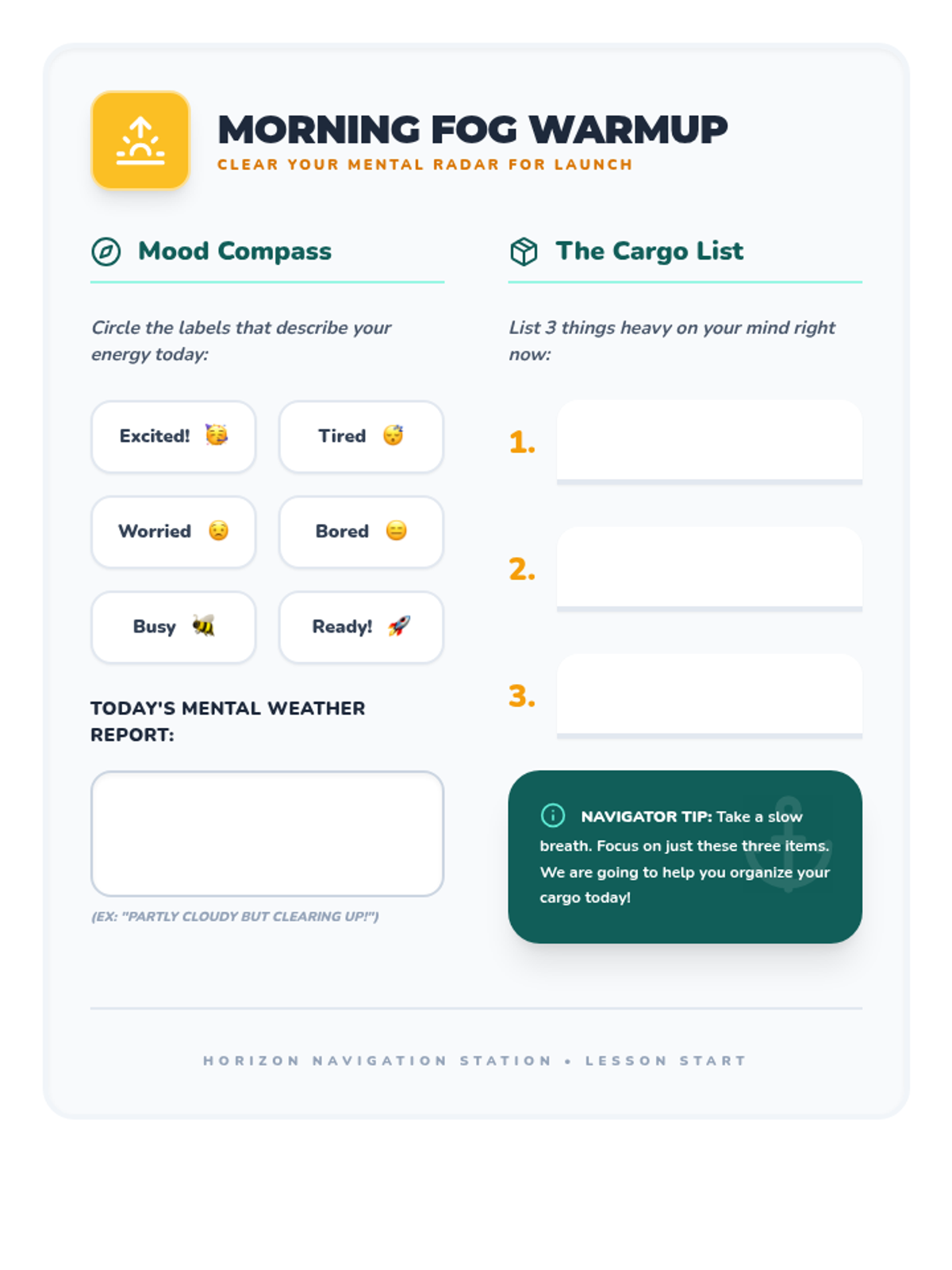A quick morning warm-up activity designed to help students identify their current emotional state and clear mental clutter before the workshop begins.