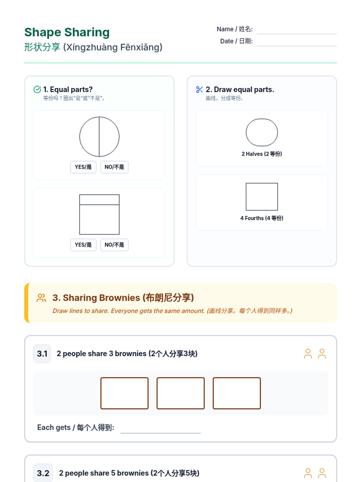 A visual slide deck updated with specific brownie sharing scenarios (2 people/3 brownies, 2 people/5 brownies, 3 people/4 brownies). Includes bilingual labels and clear visual partitioning to help ELL students understand sharing concepts.