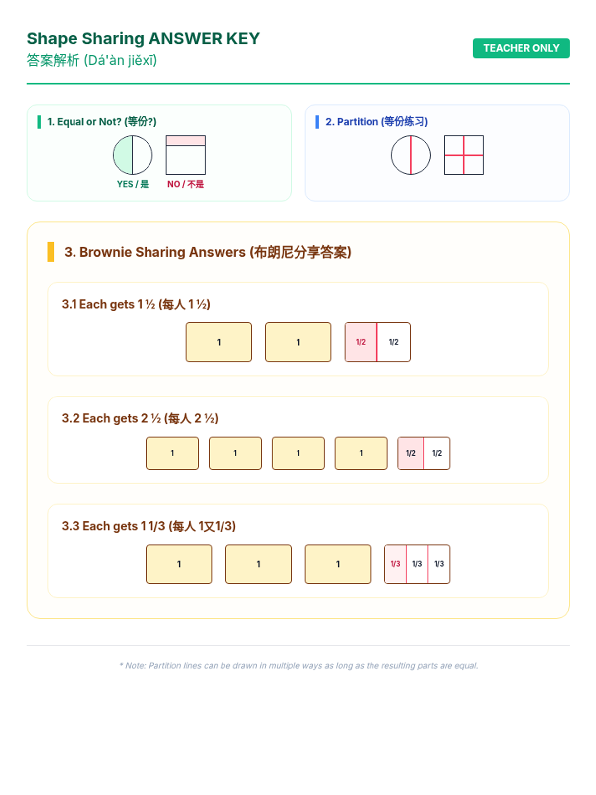 A complete answer key for brownie sharing problems. Clearly visualizes the solutions for 3 brownies/2 people, 5 brownies/2 people, and 4 brownies/3 people with colored partition indicators.