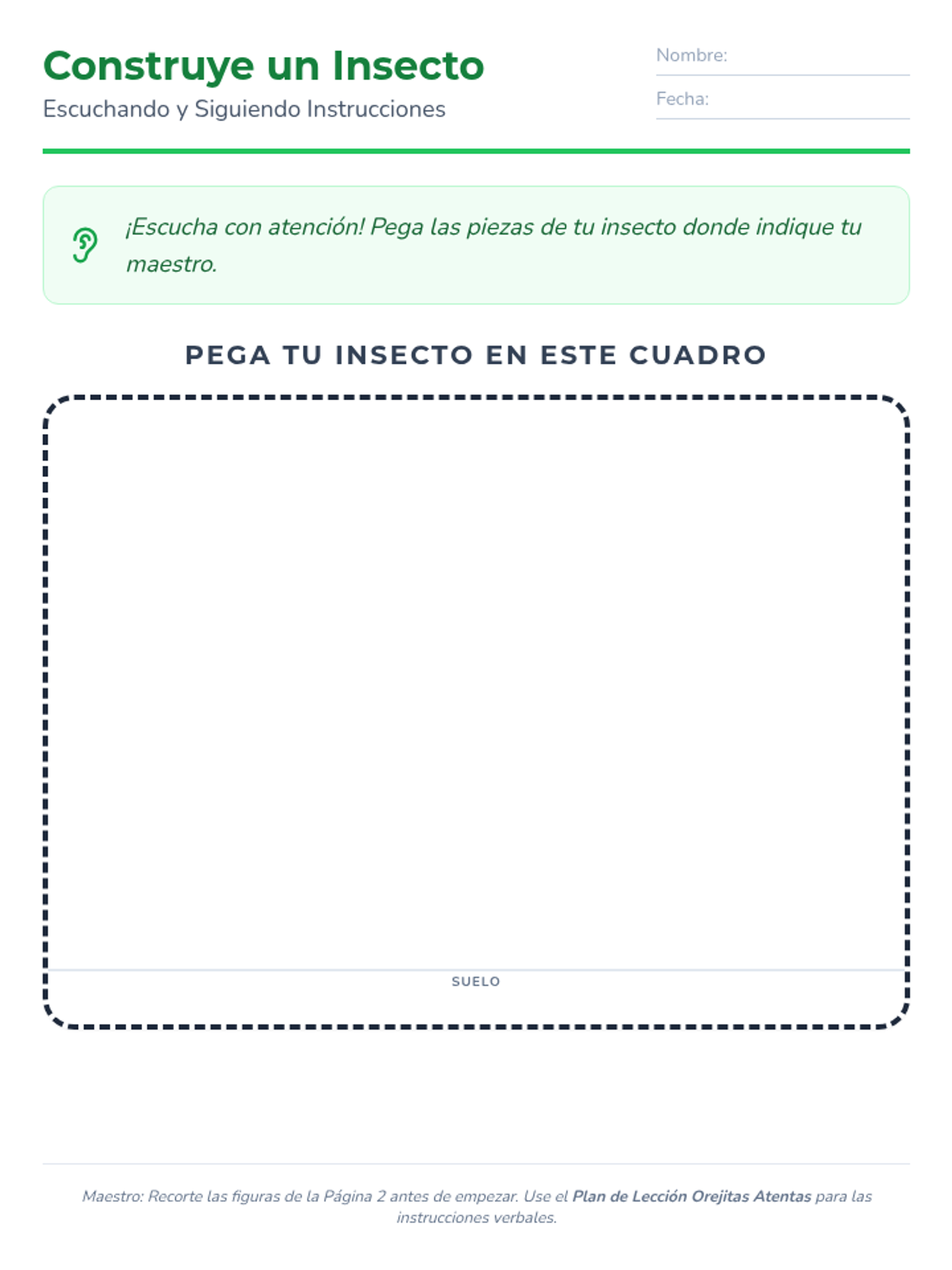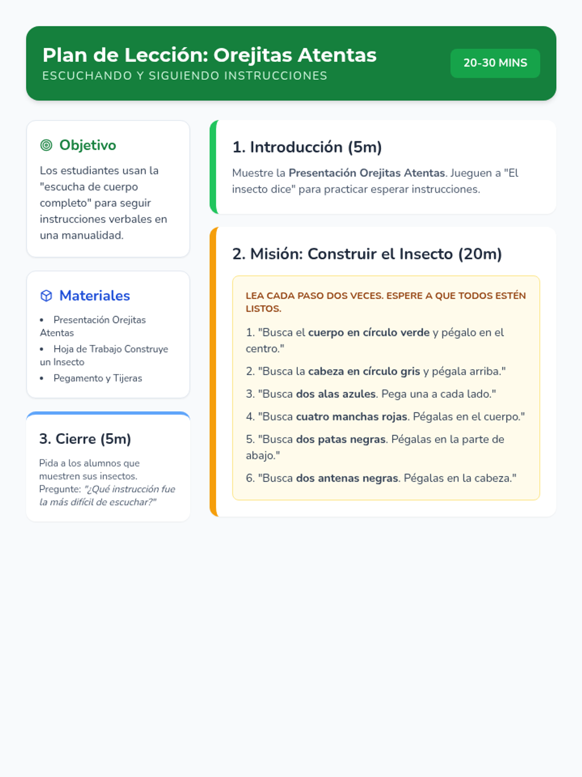 Guía del maestro para la lección de 20-30 minutos, que incluye un guion específico para la manualidad de seguir instrucciones.