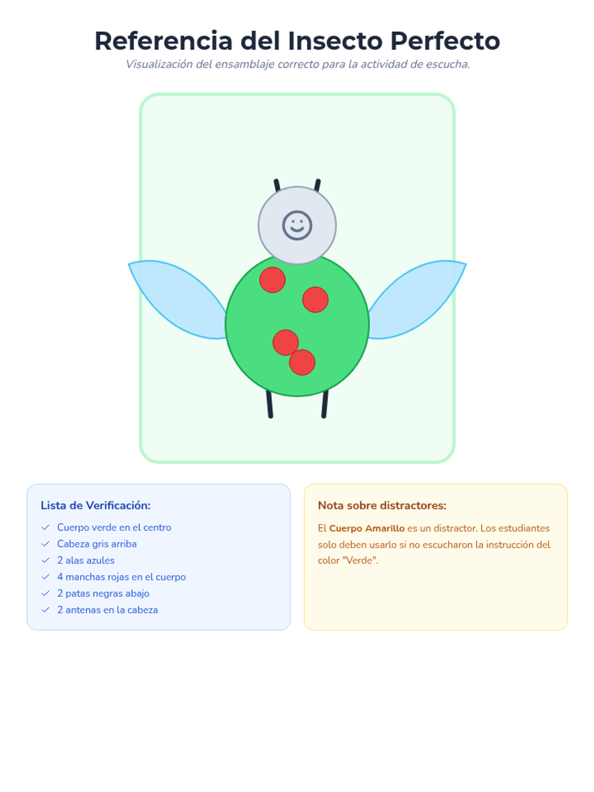 Clave de respuestas visual que muestra el insecto ensamblado correctamente, incluyendo una lista de verificación de todos los componentes.