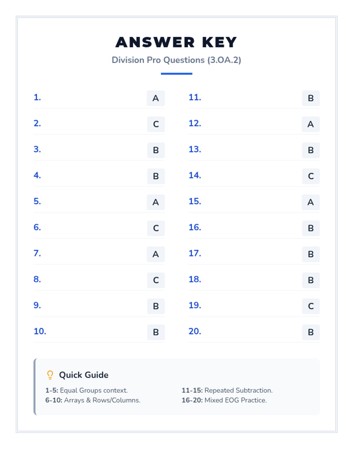 Answer key for the Division Pro Questions, including quick reference table and grading tips.