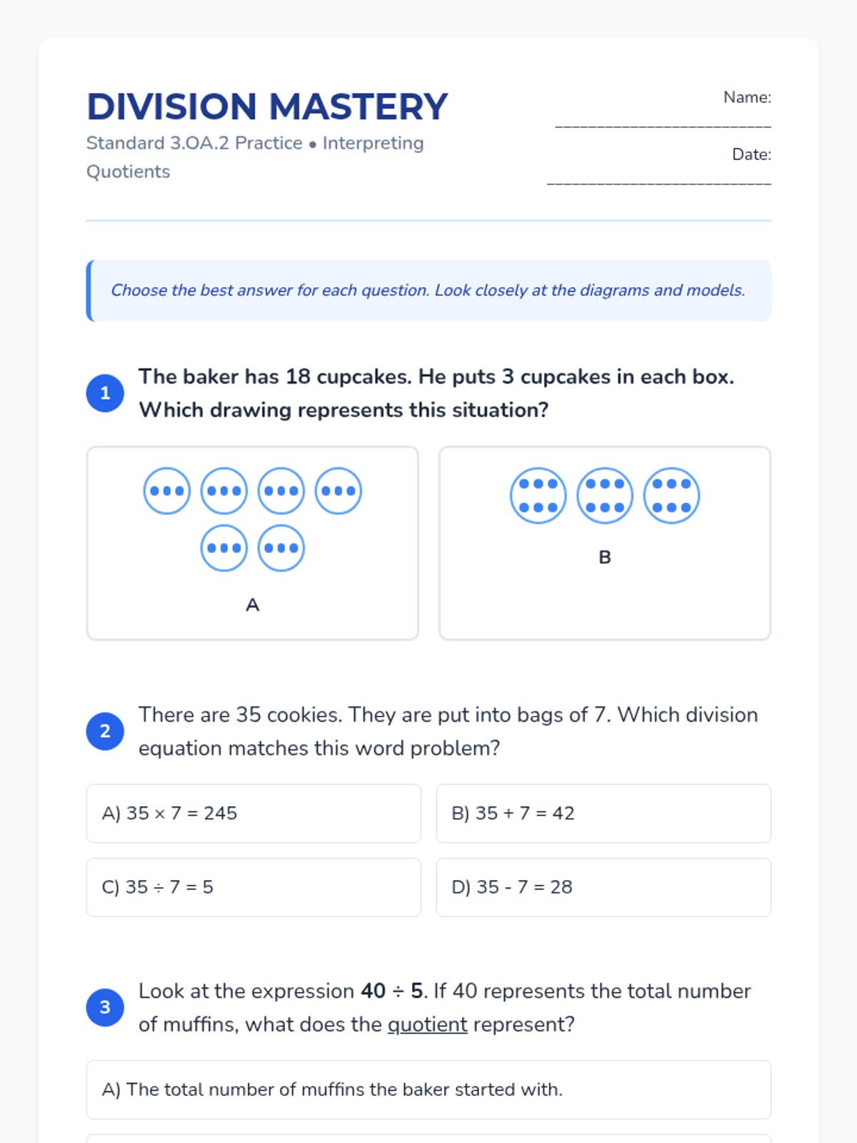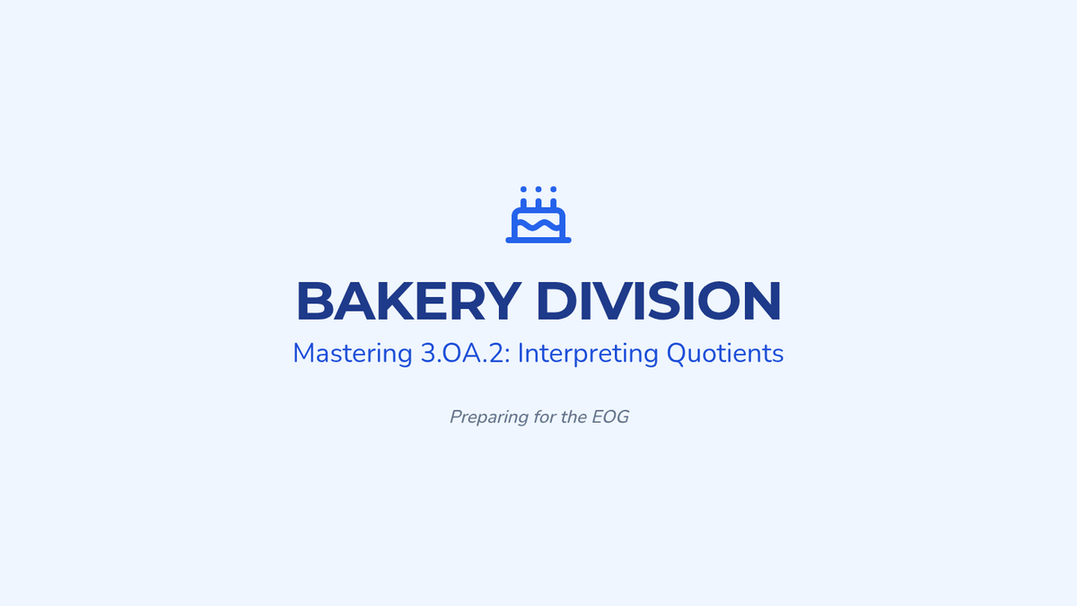 A presentation introducing three core models for division (equal groups, arrays, and repeated subtraction) using a bakery theme, aligned with 3.OA.2.