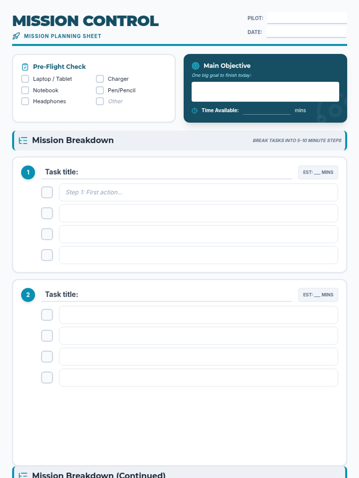 An expanded, two-page "Mission Control" themed worksheet that provides significantly more writing space for task breakdowns. It includes three dedicated task sections with multiple sub-steps per task, taller writing lines, and a comprehensive reflection section.