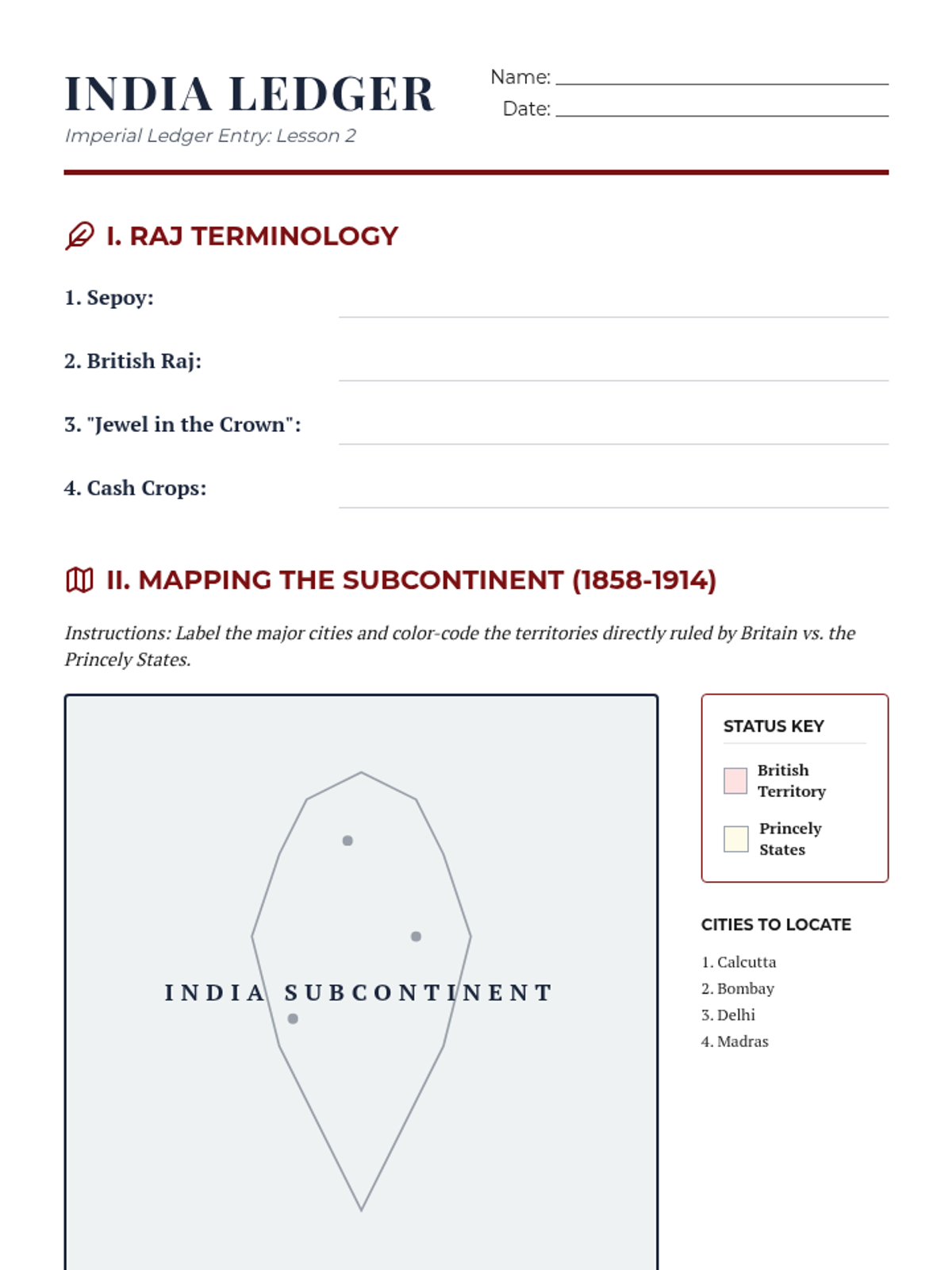 A vocabulary and map worksheet for the British Raj in India, featuring an SVG map of the subcontinent, key terms, and a cause-and-effect analysis of the Sepoy Mutiny. Optimized for handwriting with white backgrounds.