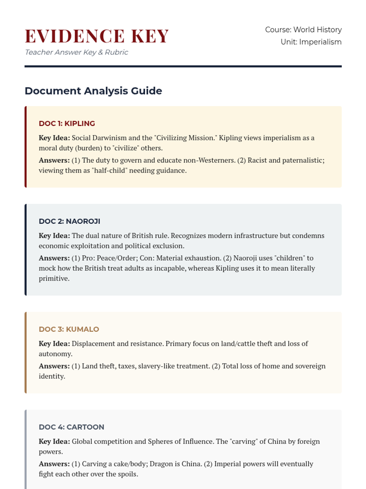 A teacher's guide and answer key for the Imperial Evidence DBQ, including document summaries, suggested answers, and a comprehensive scoring rubric. Features managed page breaks and polished formatting.