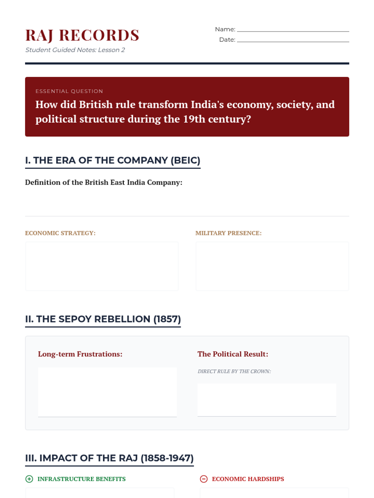 Guided lecture notes for the British Raj in India, covering the transition from the East India Company to direct rule, the Sepoy Rebellion, and the rise of Indian nationalism. Optimized for handwriting with clear sections.