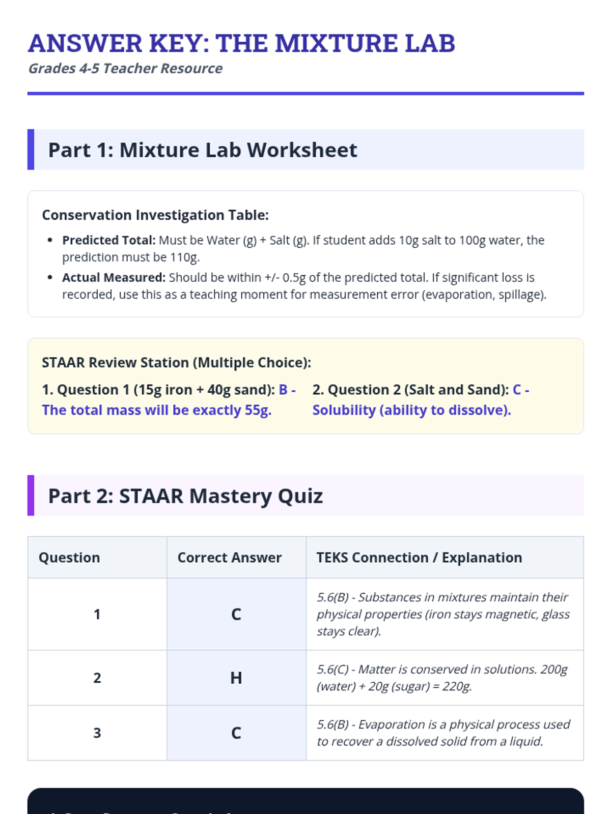 A dedicated teacher answer key for 'The Mixture Lab' lesson (Grades 4-5). It provides correct answers for the lab worksheet, multiple-choice quiz questions, and a sample response for the open-ended justification prompt.
