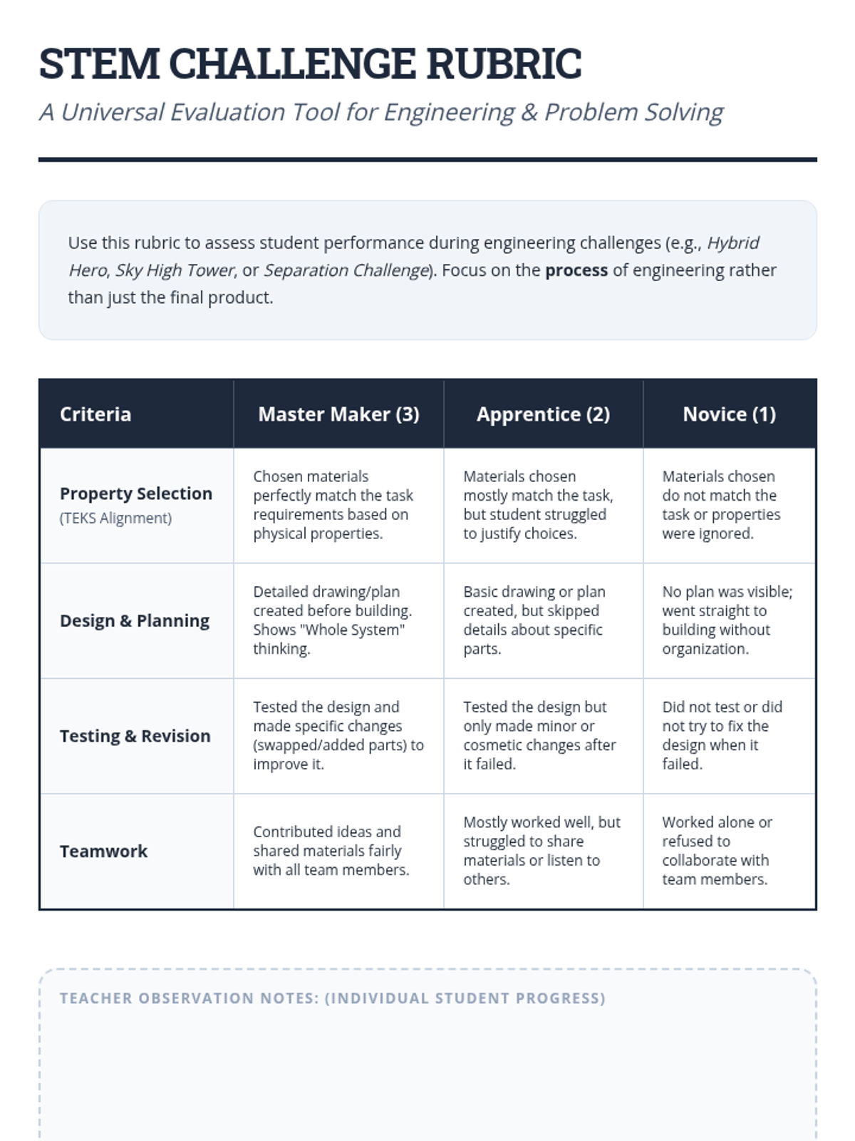A universal assessment tool for teachers to evaluate student performance during the STEM engineering challenges. It focuses on TEKS-aligned material selection, design planning, testing/revision, and teamwork.