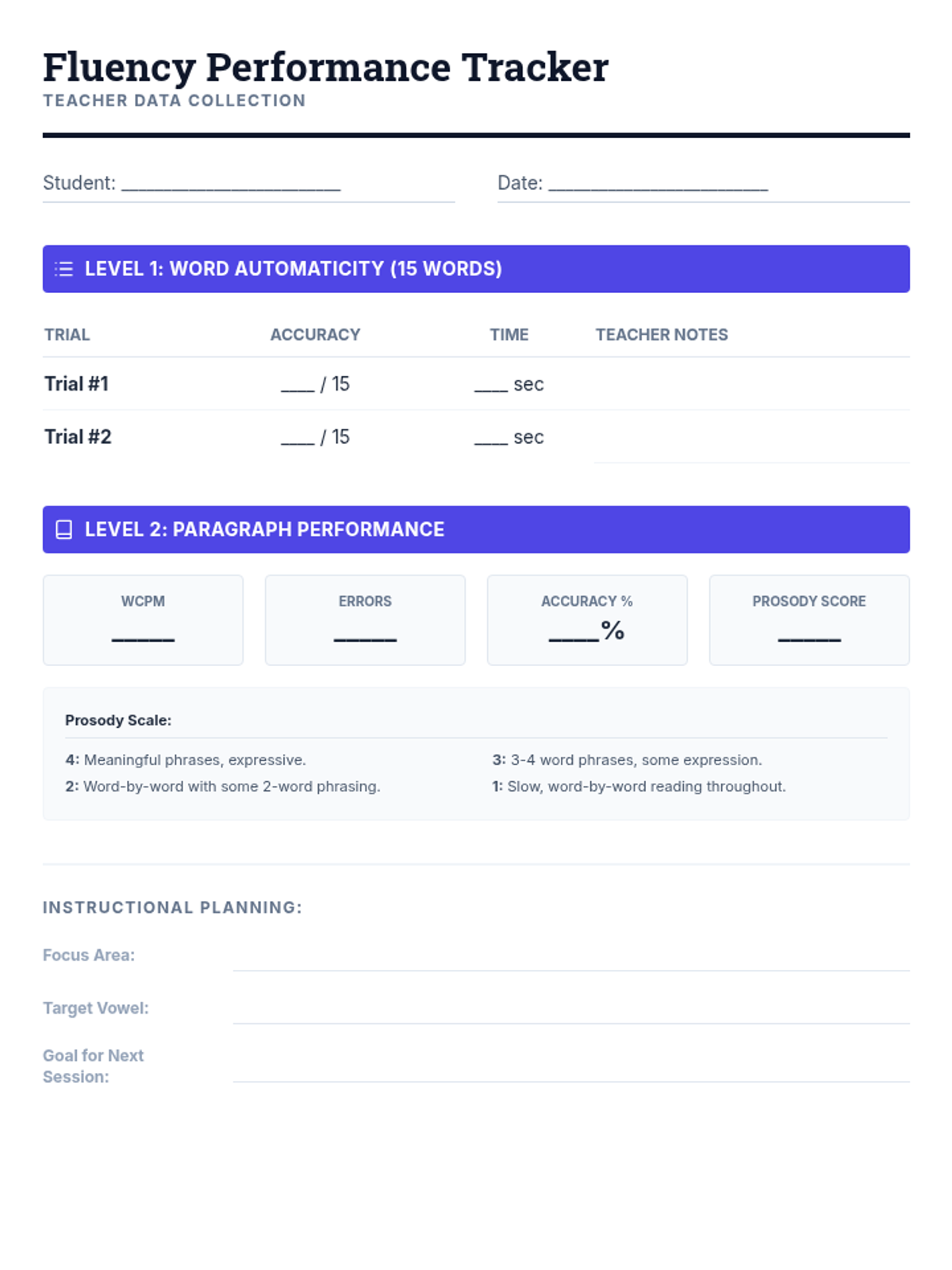 A teacher resource for tracking student progress in Magic E fluency. Features data collection tables for word-level automaticity (time/accuracy) and a multi-dimensional fluency scale for assessing paragraph-level prosody and expression.