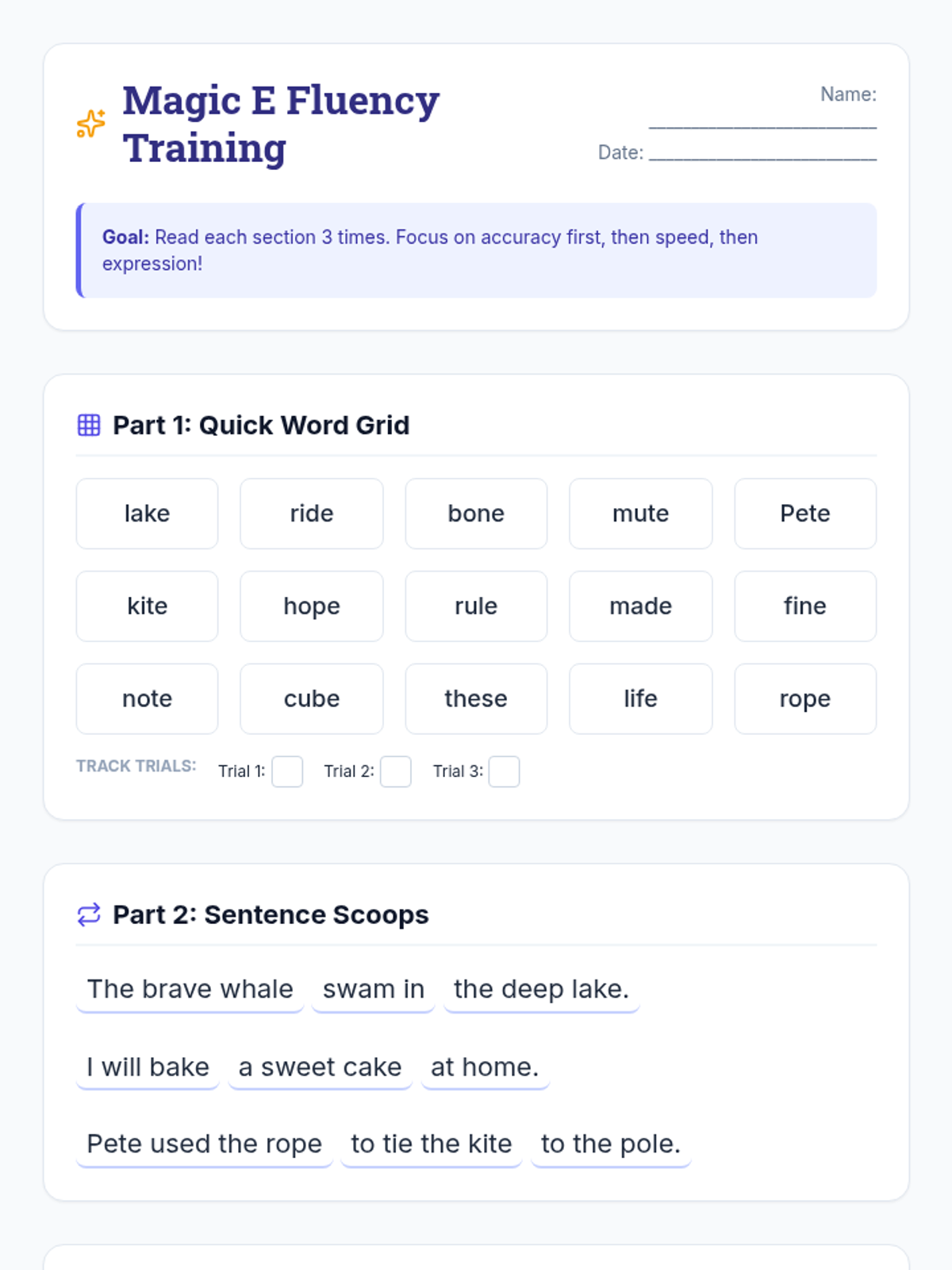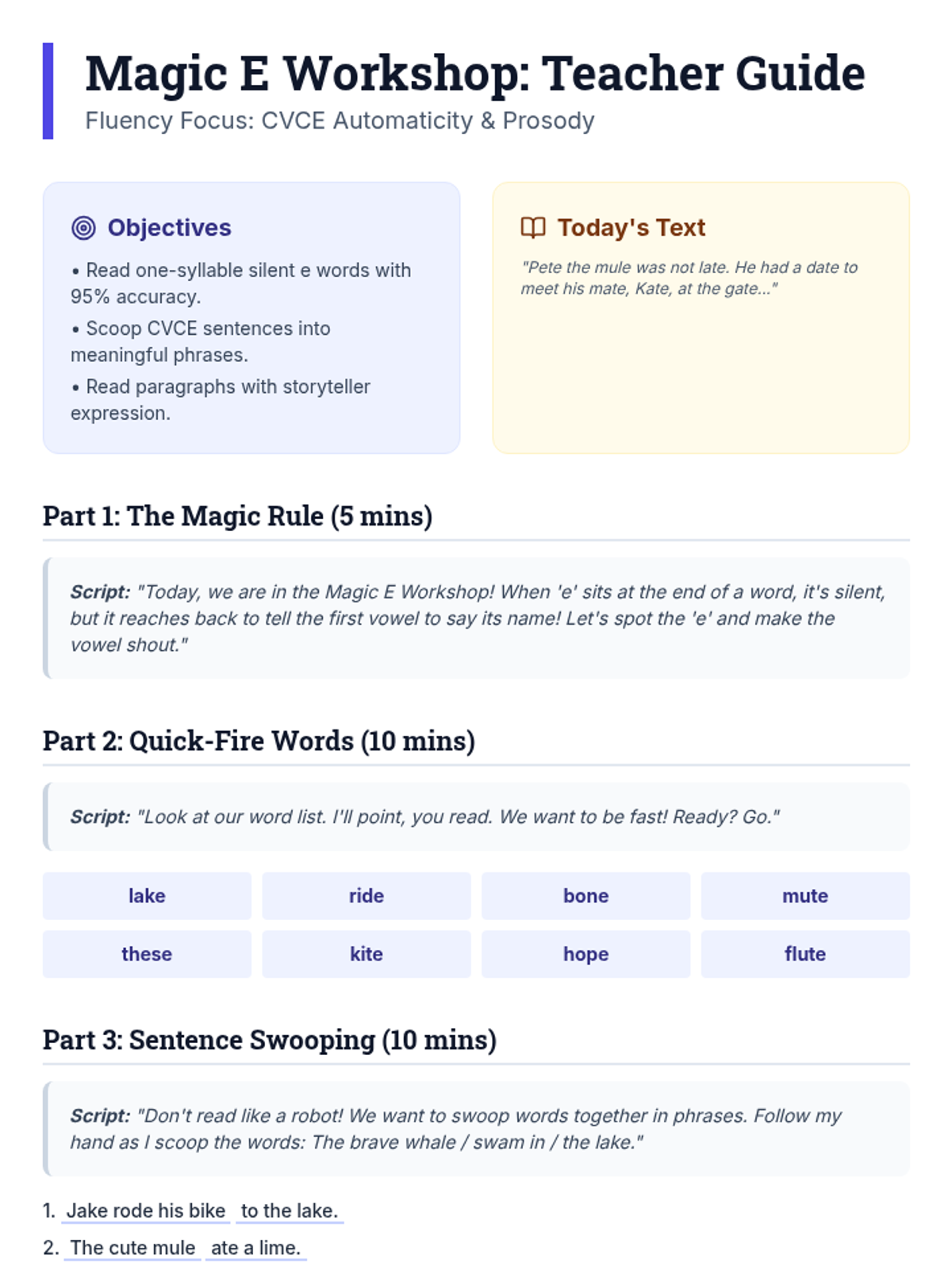A detailed, scripted lesson plan for teachers focusing on silent e fluency. It includes instructional goals, specific teacher prompts for word, sentence, and paragraph levels, and differentiation strategies.