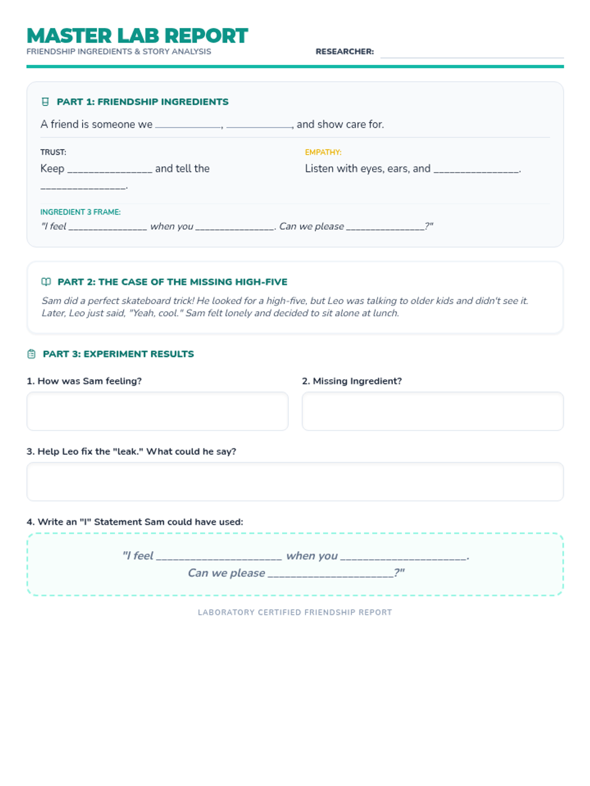 A comprehensive, single-page student handout that combines the Friendship Lab guided notes, the "Missing High-Five" social story, and the analysis worksheet for efficient printing and classroom use.