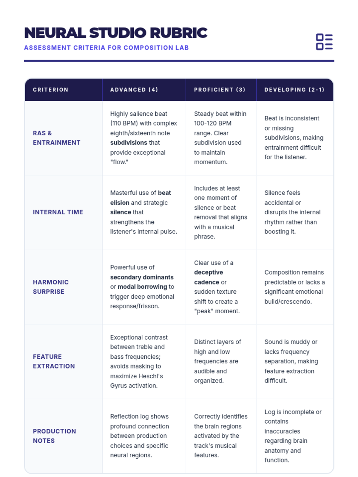 A teacher-facing rubric for assessing the Neural Studio Soundtrap project, covering criteria such as rhythmic entrainment, harmonic surprise, and scientific reflection.