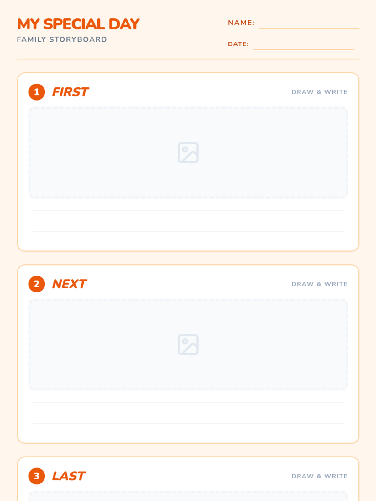 A differentiated storyboard worksheet for Grade 1 students to plan their family tradition narrative, featuring space for drawing, writing, and a descriptive word bank.