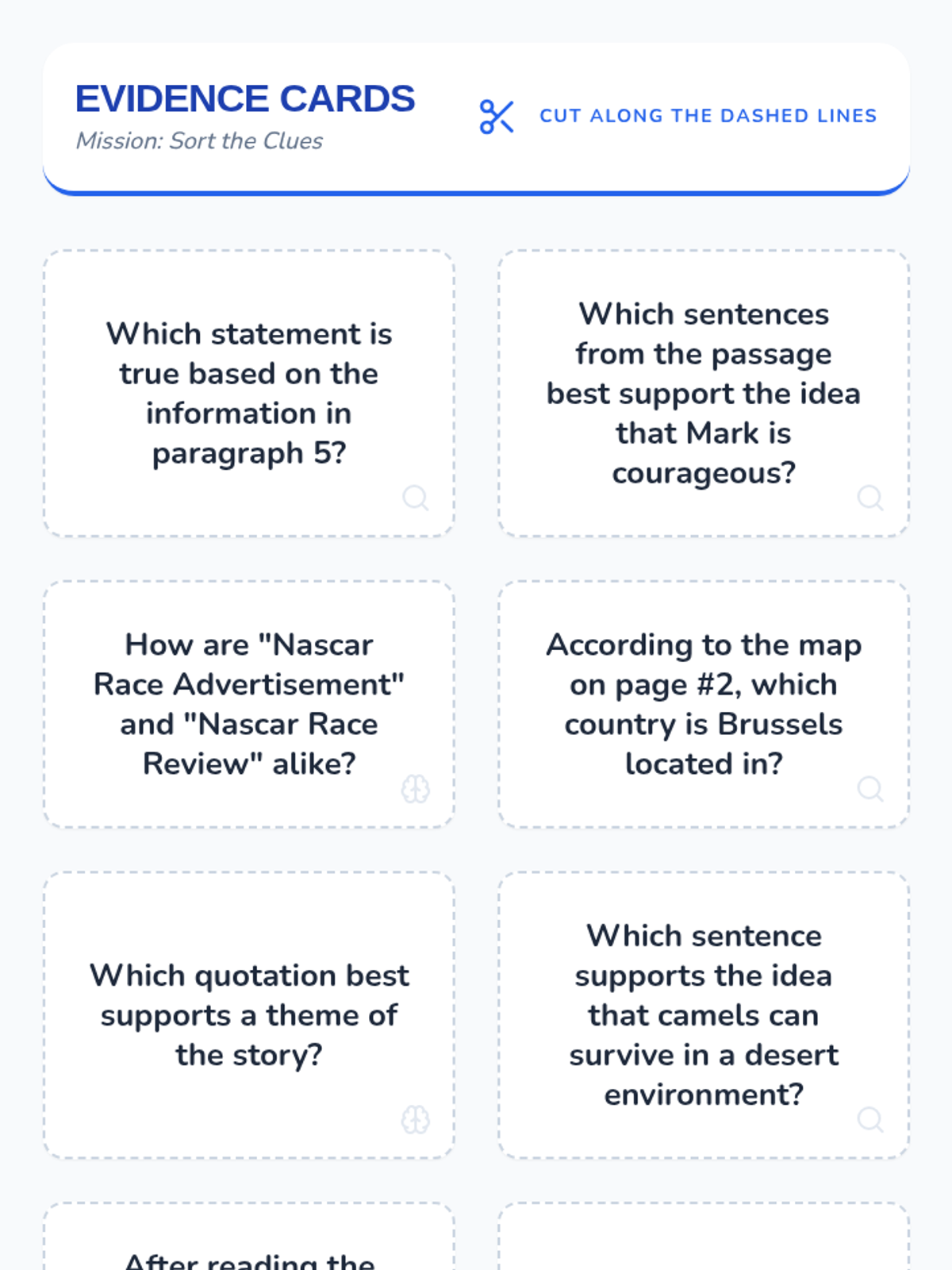 A set of 10 printable question cards for the sorting activity, featuring dashed lines for cutting and subtle visual icons for scaffolding.