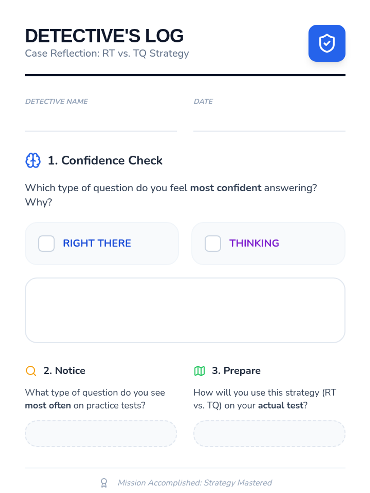 A detective-themed reflection sheet for students to assess their confidence and application of the RT vs. TQ test-prep strategy.
