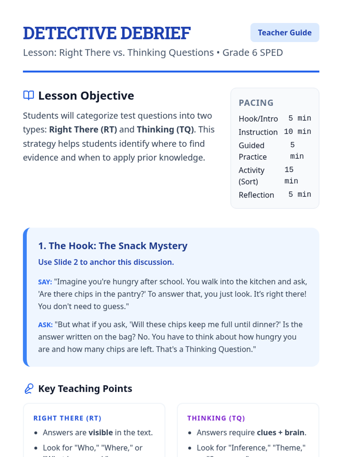A comprehensive teacher guide for the Question Detectives lesson, including pacing, a hook script, instructional tips, and discussion prompts tailored for a 6th grade SPED environment.