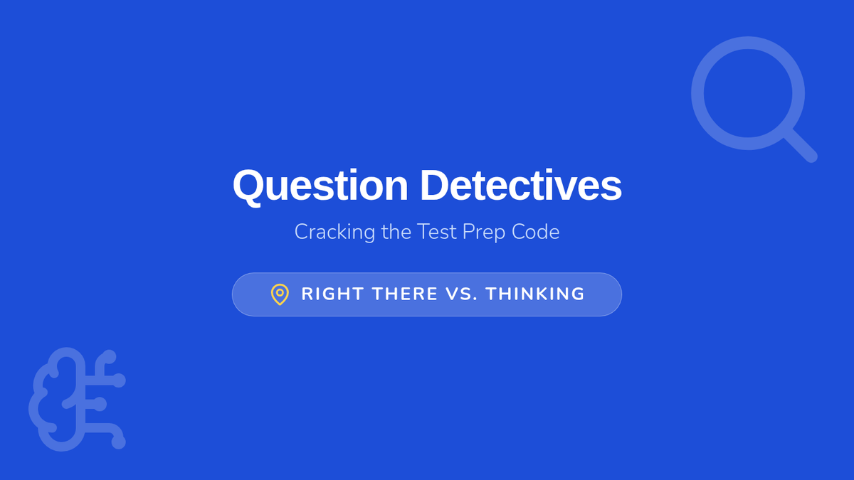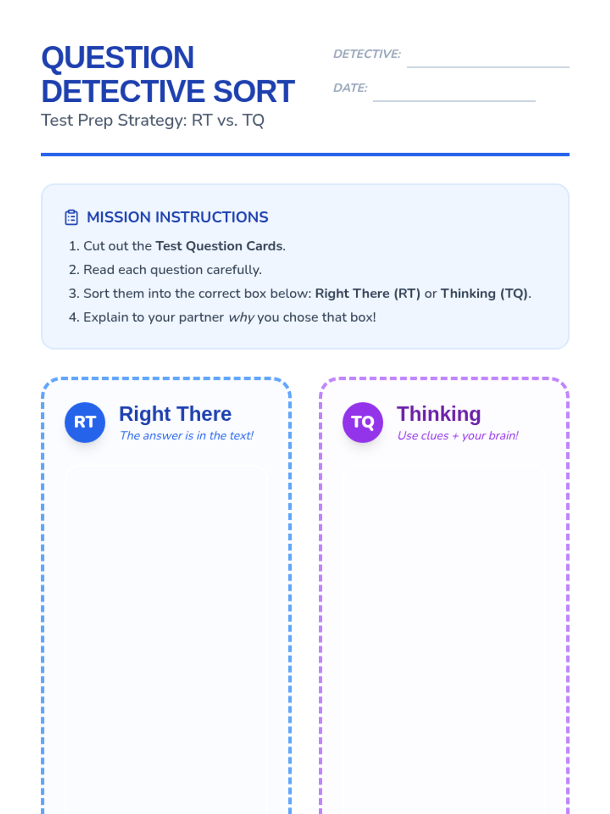 A detective-themed sorting mat for students to categorize test questions as 'Right There' or 'Thinking' during the Question Detectives lesson.