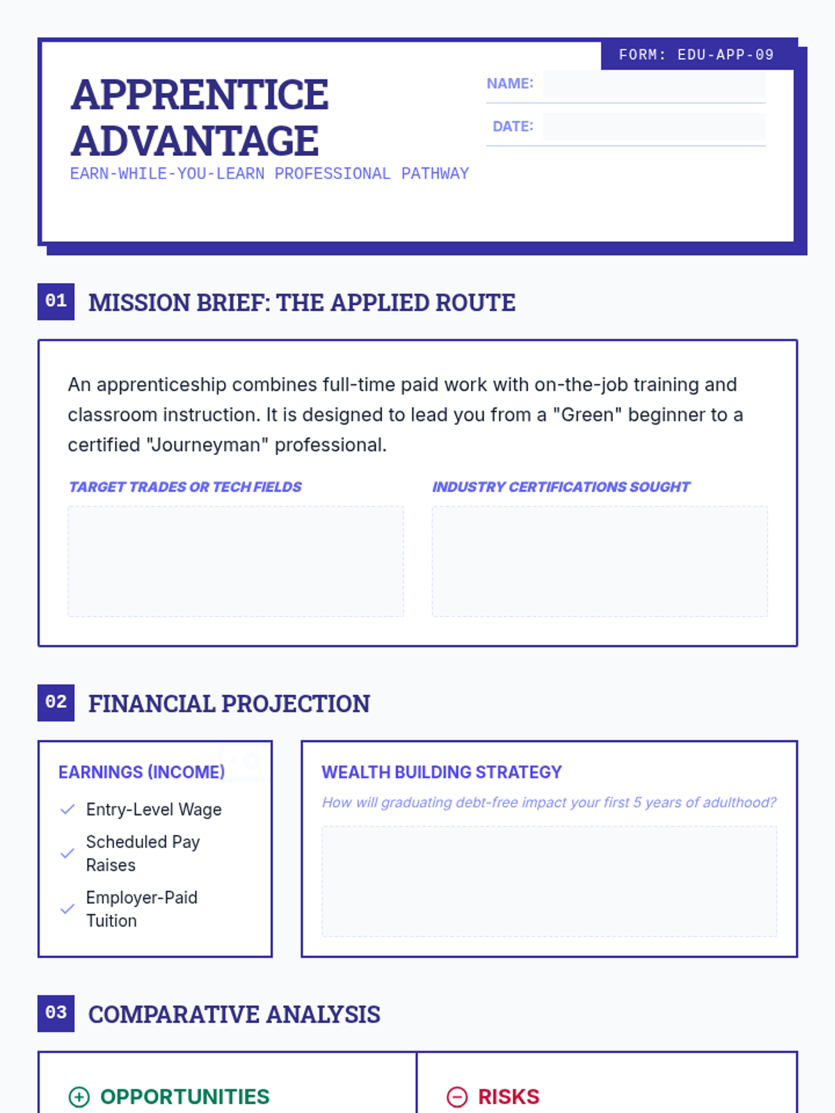 A structured worksheet for students to analyze the apprenticeship pathway, highlighting the earn-while-you-learn model, career specific pros/cons, and financial benefits.