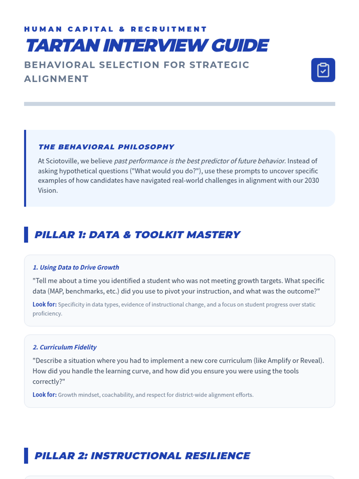 A supplemental guide for administrators and hiring teams featuring behavioral interview questions tailored to the Sciotoville strategic vision and Tartan Pride culture. Includes "Look-Fors" and the STAR evaluation method.