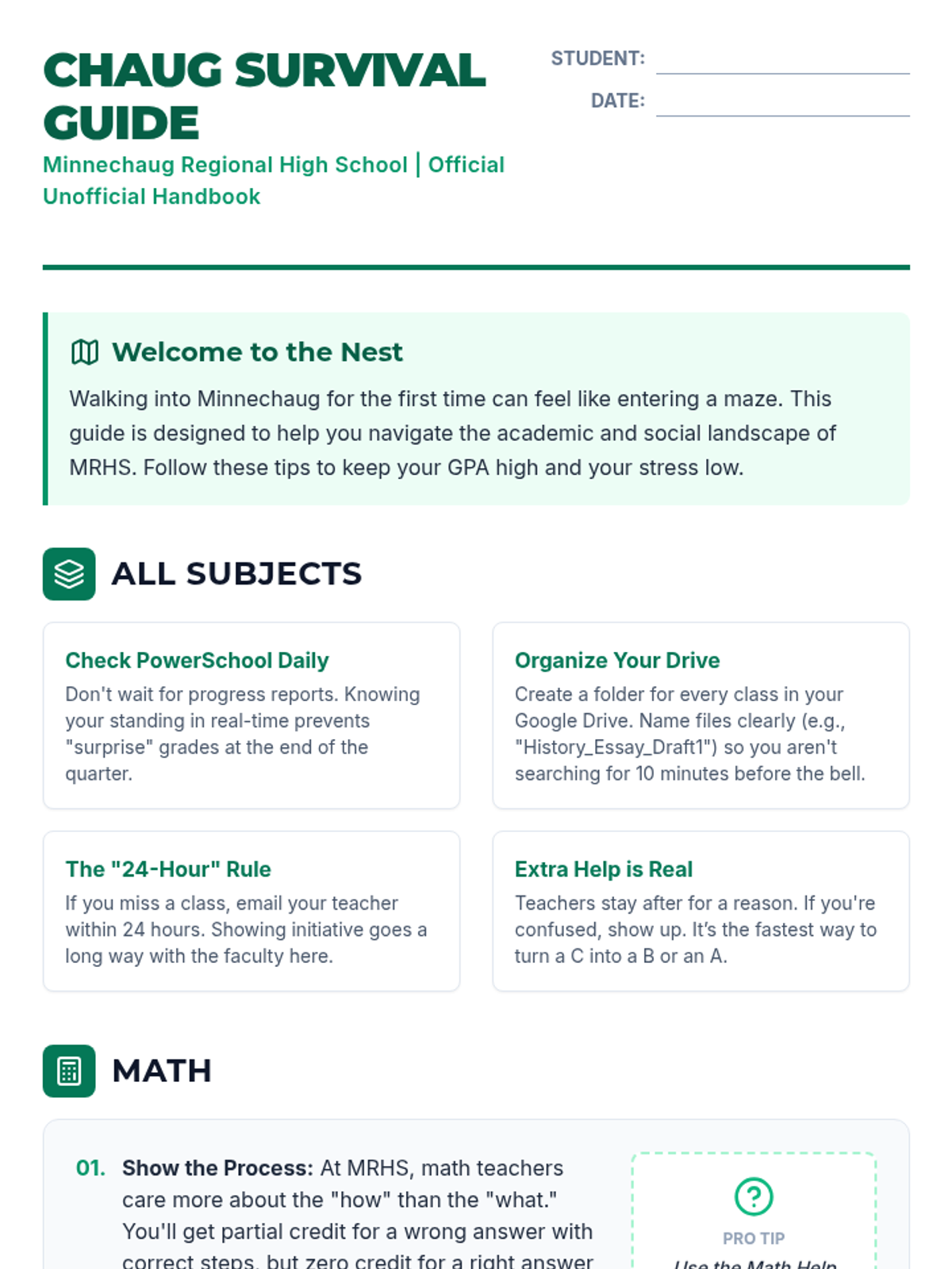 A comprehensive survival guide for Minnechaug Regional High School students, featuring academic tips for Math, Lit, and PE with a professional scholastic theme.