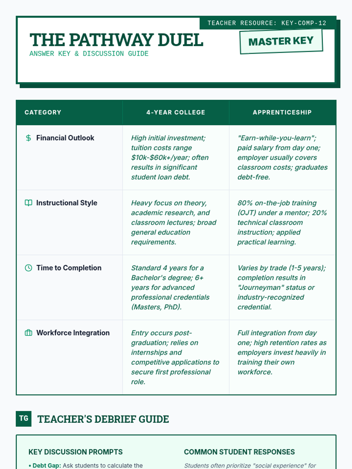 An answer key and discussion guide for the Pathway Comparison Chart, providing specific comparison points between college and apprenticeships along with teacher prompts.