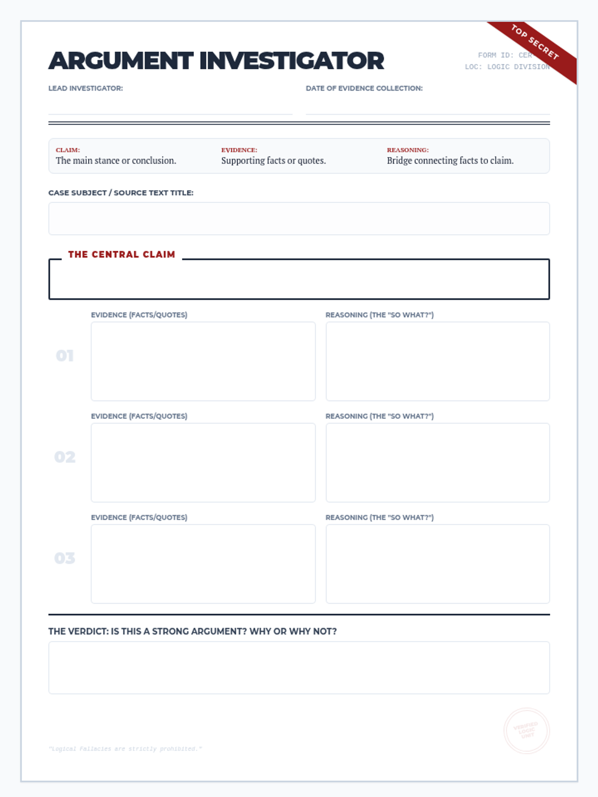 A detective-themed printable graphic organizer for students to analyze arguments using the Claim, Evidence, and Reasoning (CER) framework. Includes structured boxes for a central claim, supporting evidence, and logical reasoning for each piece of evidence.