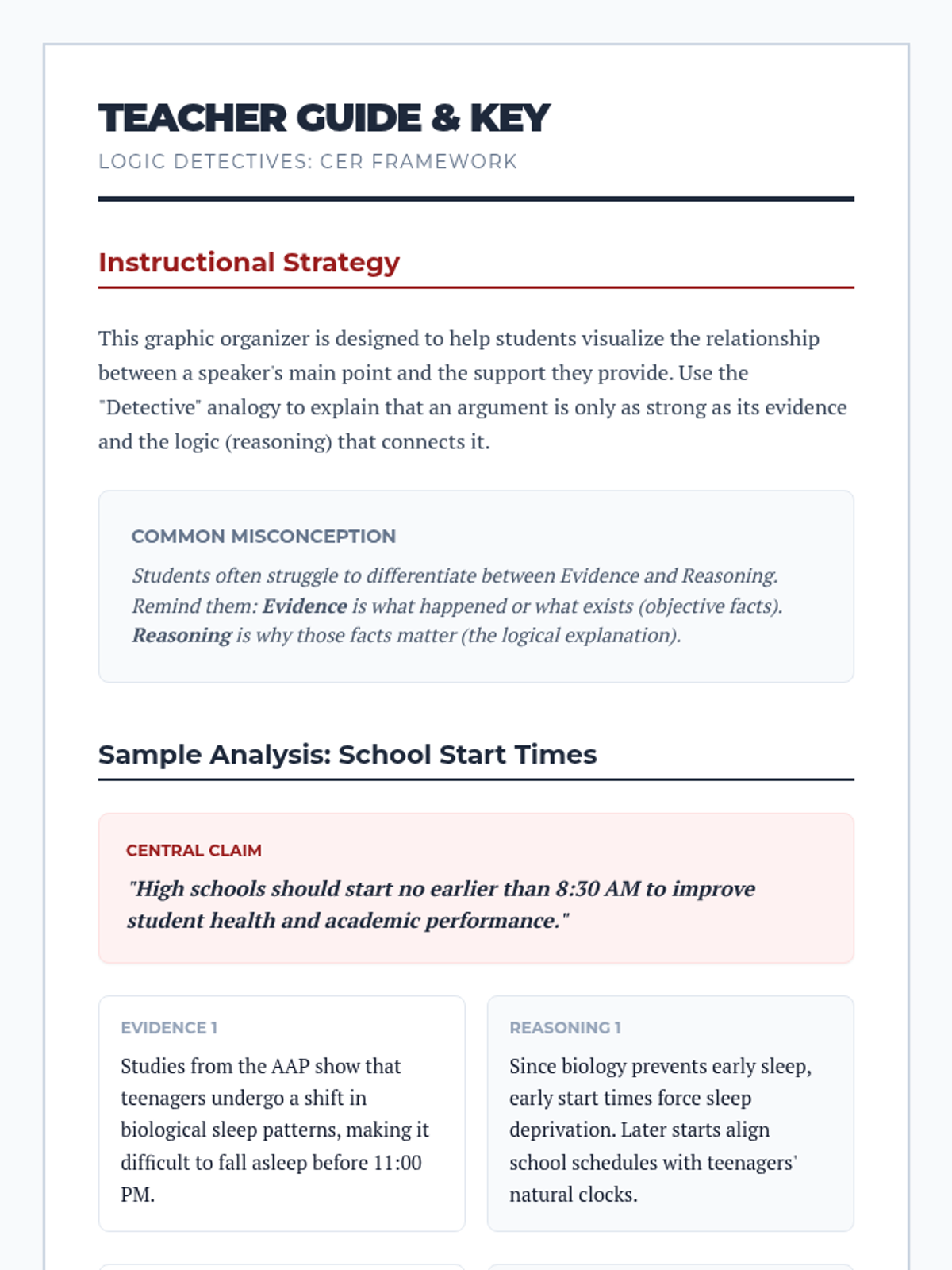 A teacher's guide for the Argument Investigator worksheet, providing instructional tips, common student misconceptions, and a complete sample answer key analyzing an argument about school start times.