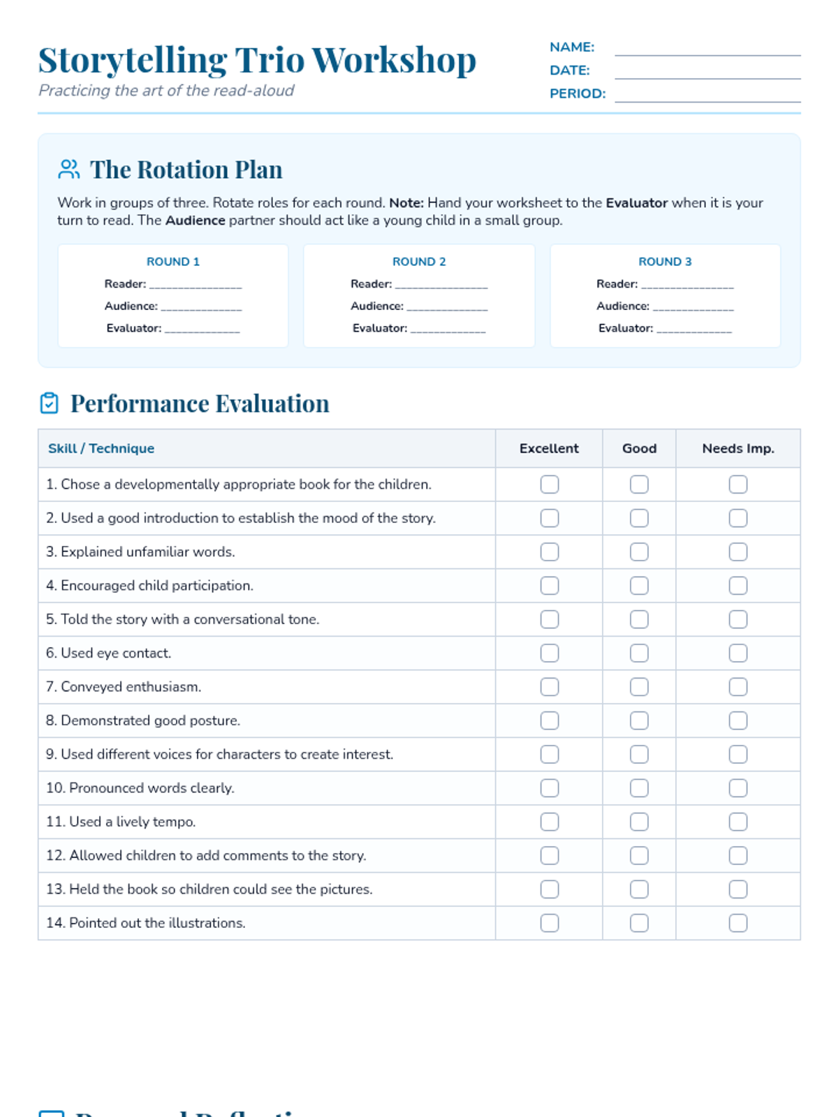A printable storytelling evaluation worksheet designed for small groups of three, including a role rotation guide, a 14-point skill checklist, and a reflection section for students to assess their read-aloud techniques.