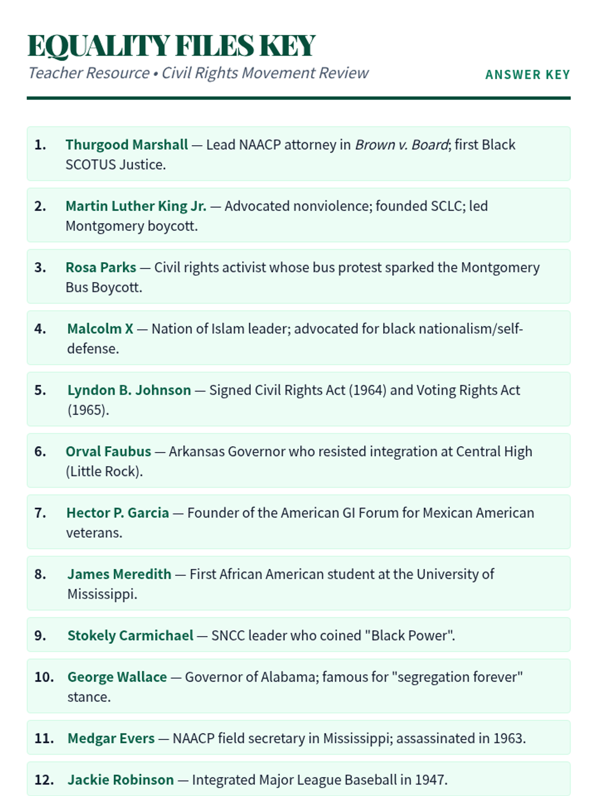 A comprehensive teacher's answer key for the Civil Rights Review, including a question-to-standard alignment guide based on High School TEKS. Includes randomized answer distribution.