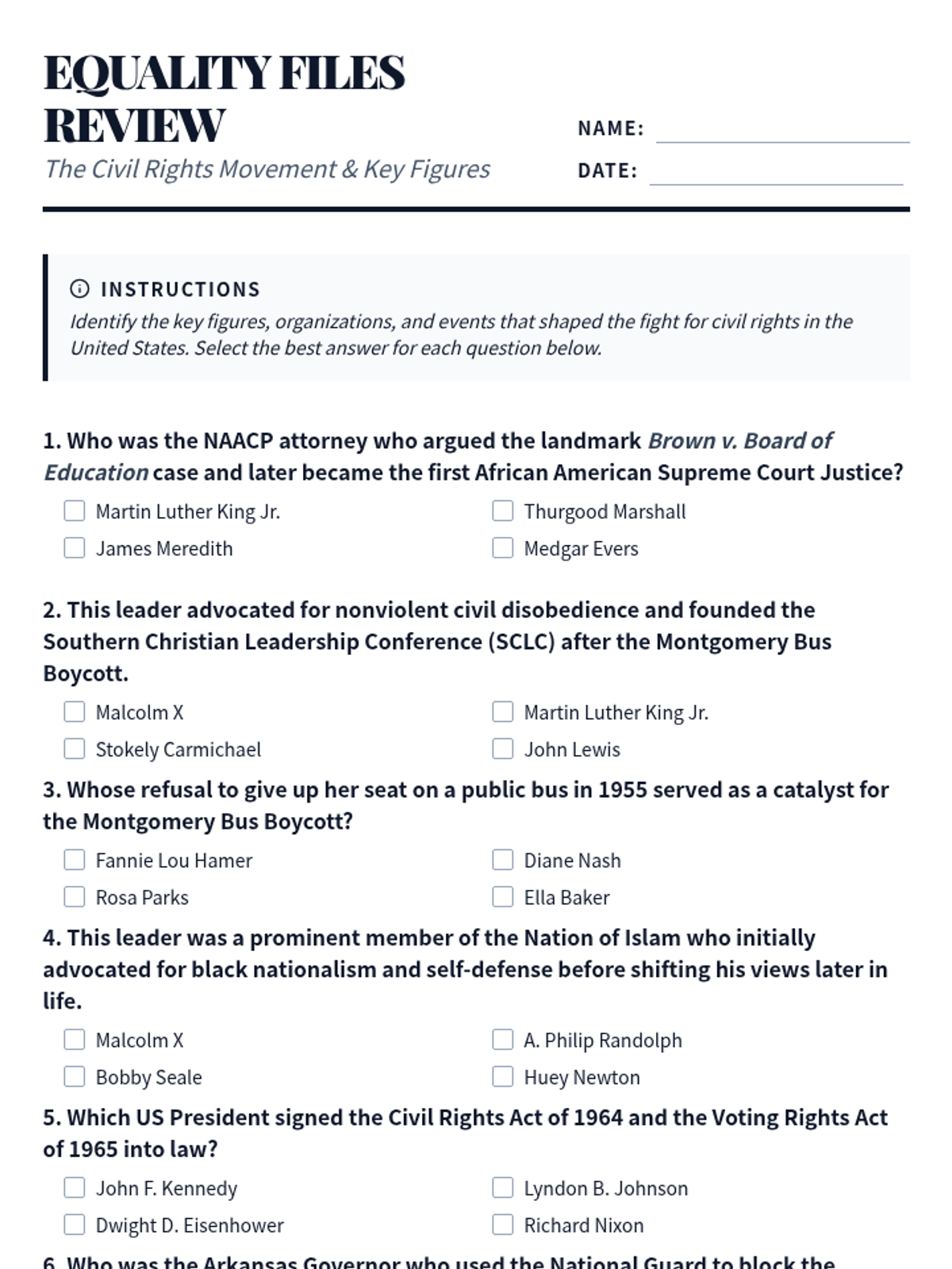A revised 25-question multiple choice review for high school students covering the key figures and organizations of the Civil Rights Movement. Updated with CSS to prevent questions from splitting across page breaks.