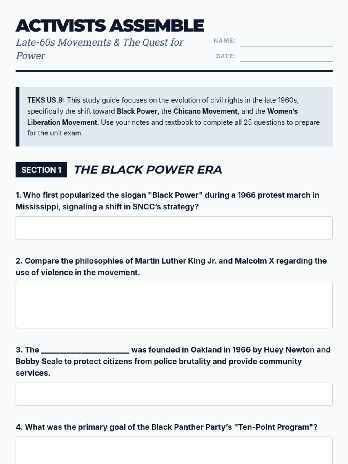 A comprehensive 25-question study guide for Texas High School US History, focusing on the Black Power era, Chicano Movement, and Women's Liberation Movement of the late 1960s. Includes name/date fields and organized sections for student responses.