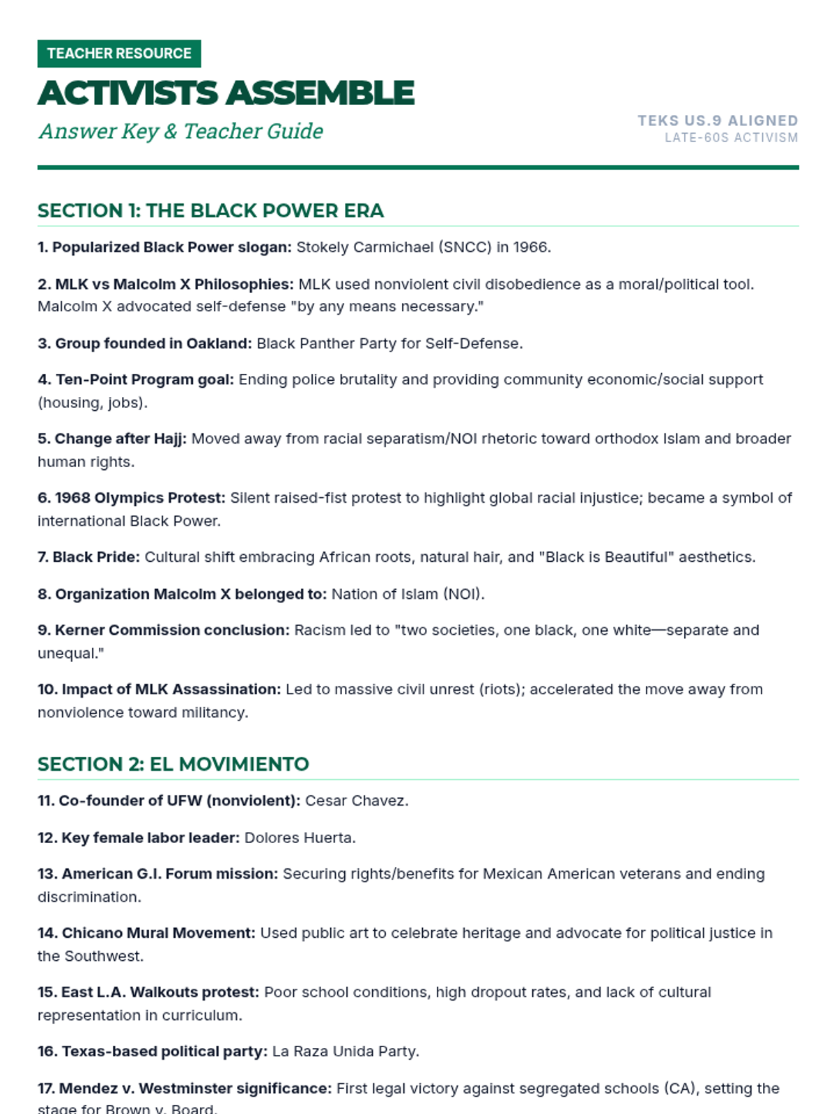A teacher's answer key for the 'Activists Assemble' study guide. Provides concise, accurate answers for all 25 questions, specifically tailored to Texas TEKS US.9 standards for high school history.