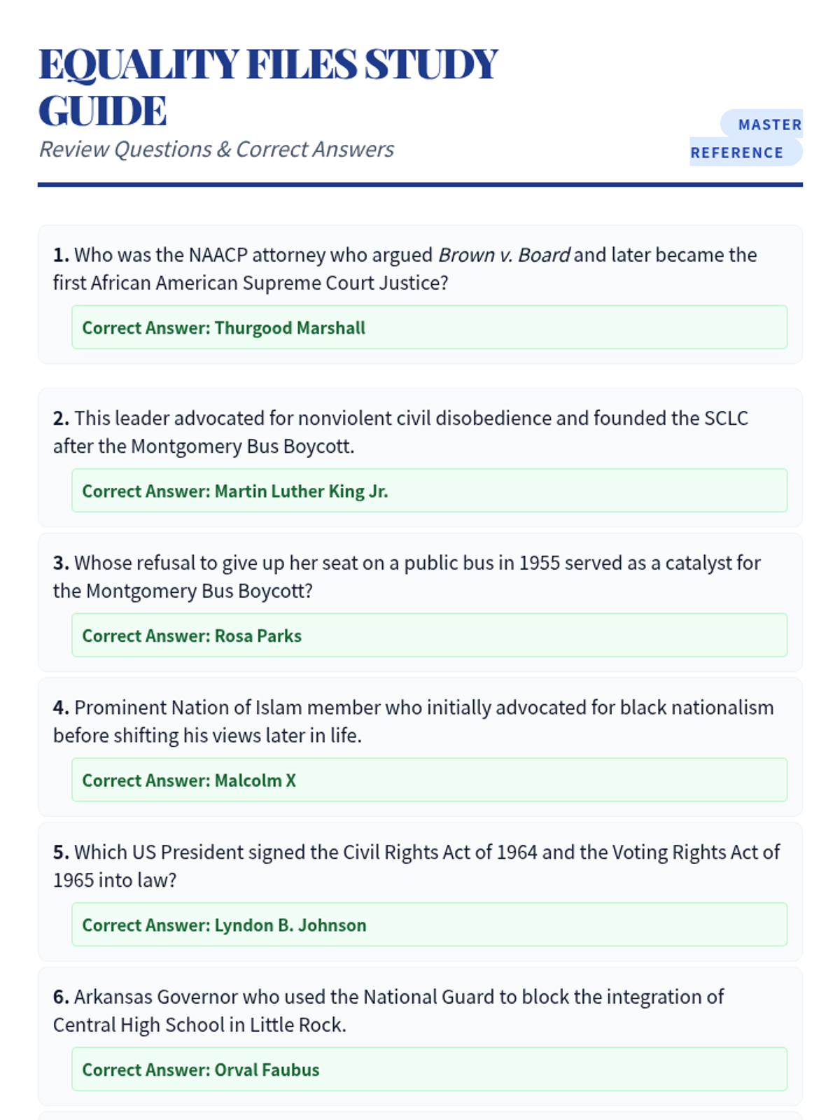 A comprehensive study guide featuring 25 questions about the Civil Rights Movement with the correct answers clearly identified. Designed for student review and study.