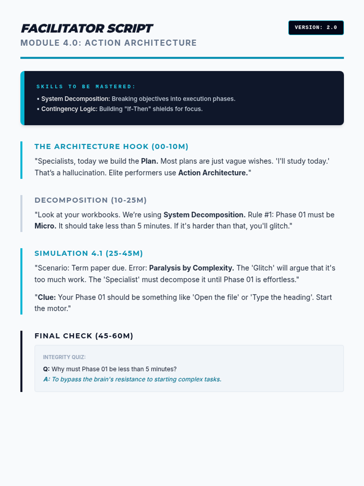 A detailed facilitator script for Lesson 4 (Action Architecture), covering the 'hallucination vs plan' hook, system decomposition rules, the 'Complexity Paralysis' role-play, and the wrap-up integrity quiz. Revised for better layout and content completeness.