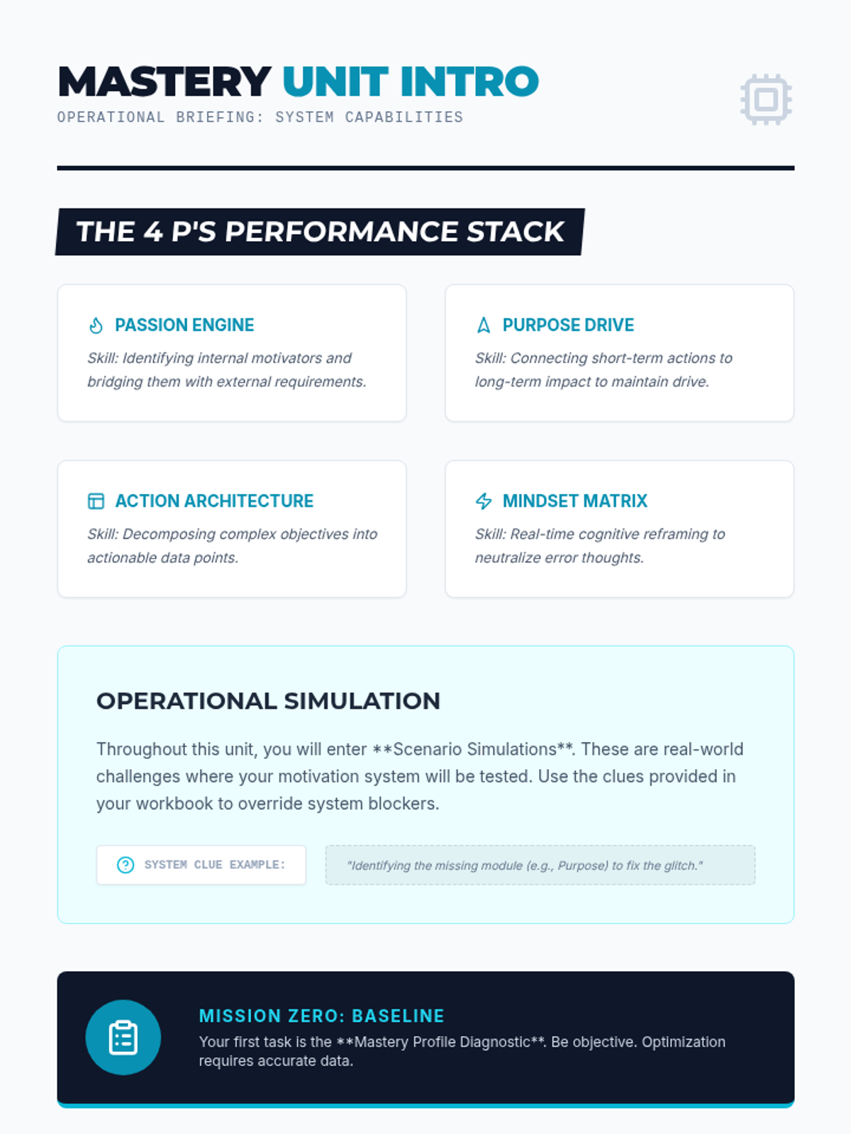 An introductory document for the Mastery Mode unit, explaining the 4 P's performance stack, the skills students will build, and the structure of the upcoming scenario simulations. Revised to fix page breaks.