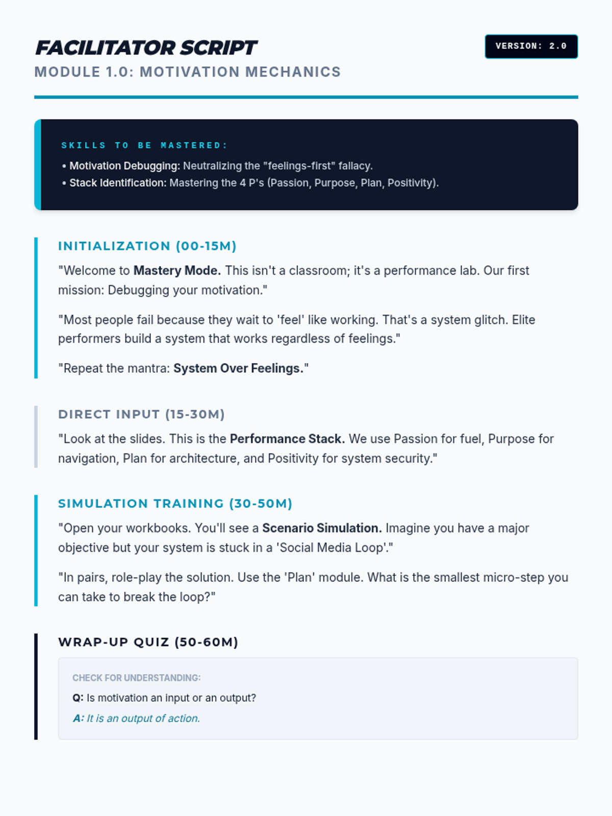 A comprehensive word-for-word facilitator script for Lesson 1, detailing the 'Initialization', 'Direct Input', 'Diagnostic', and 'System Review' phases with specific talk-tracks for engaging teenagers. Revised for better layout and content completeness.
